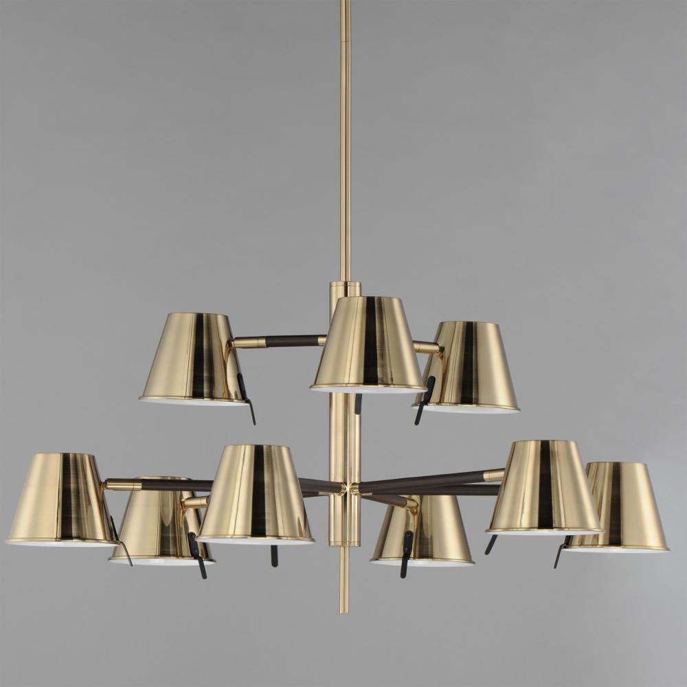Metal shades finished in a warm Heritage Brass are accented with Dark Bronze metal straps and Tobacco Brown leather wrapped details. Recessed within the metal shades, a frosted glass diffuser softly casts the LED light source within. Paddles on every shade