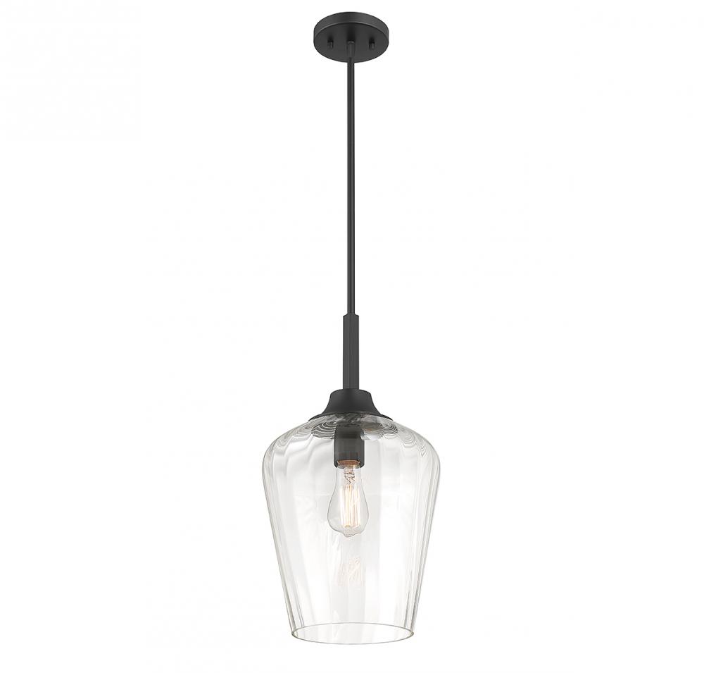 The Savoy House Carlton 1-light pendant features a beautifully streamlined style highlighted by a shade of ribbed glass that gives a hint of motion. Finished in matte black. Carlton is 11" in width and 20" in height. Comes with four 12" downrods and one 6" downrod. Uses 1 standard size bulb with a max of 60 watts (bulb not included).