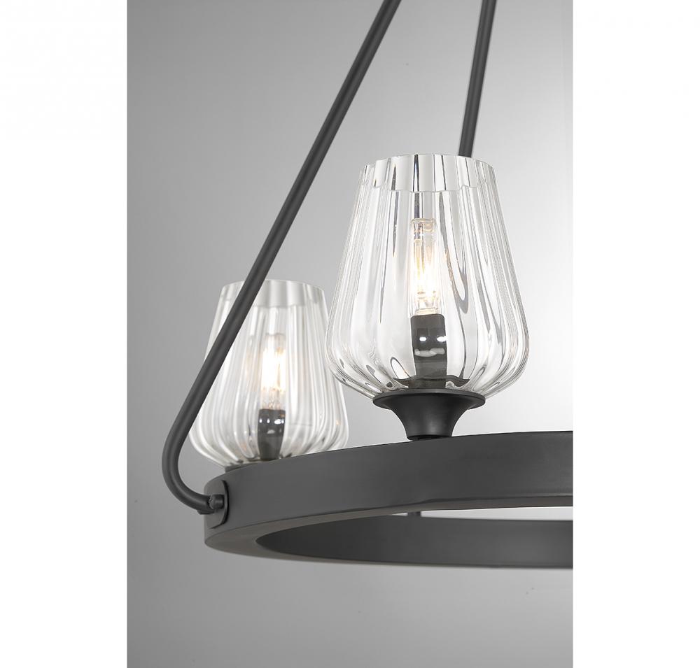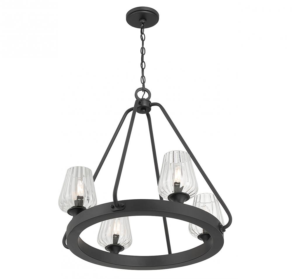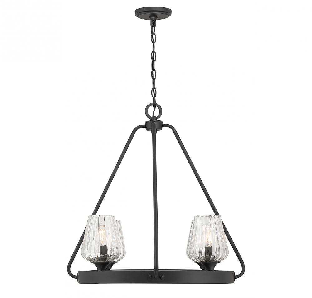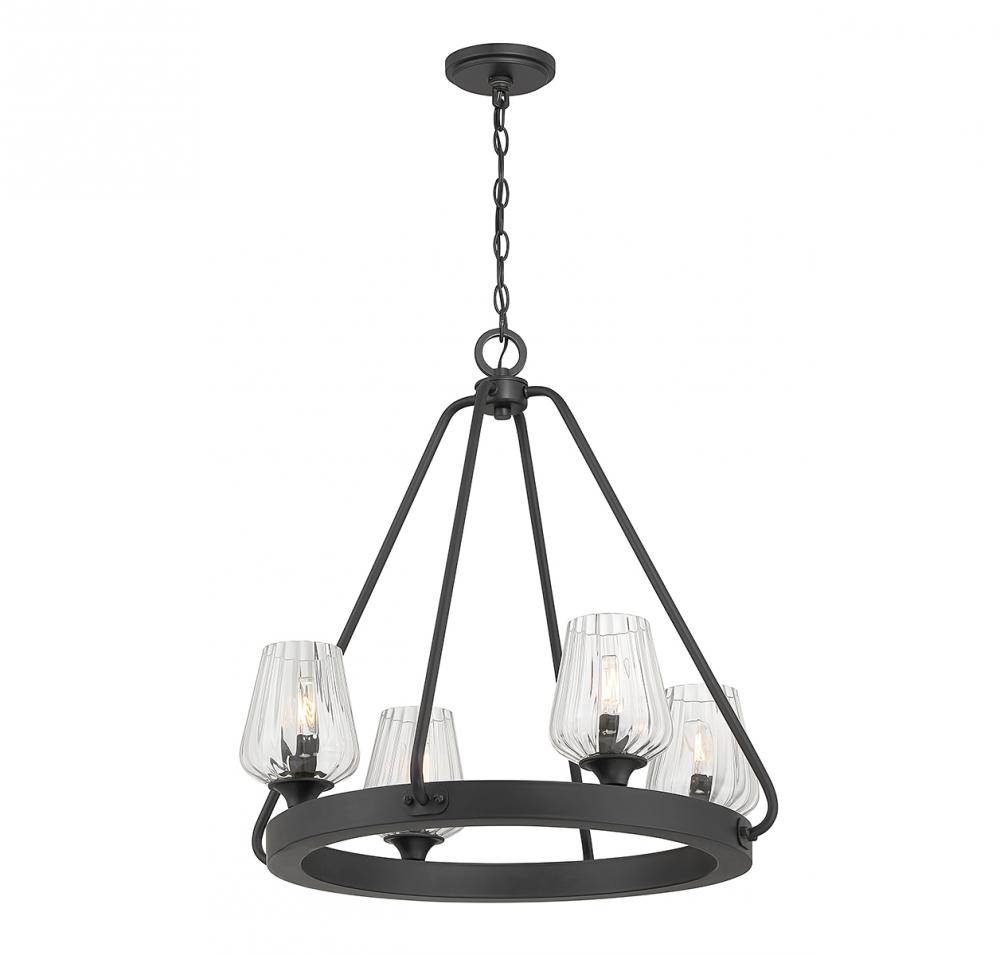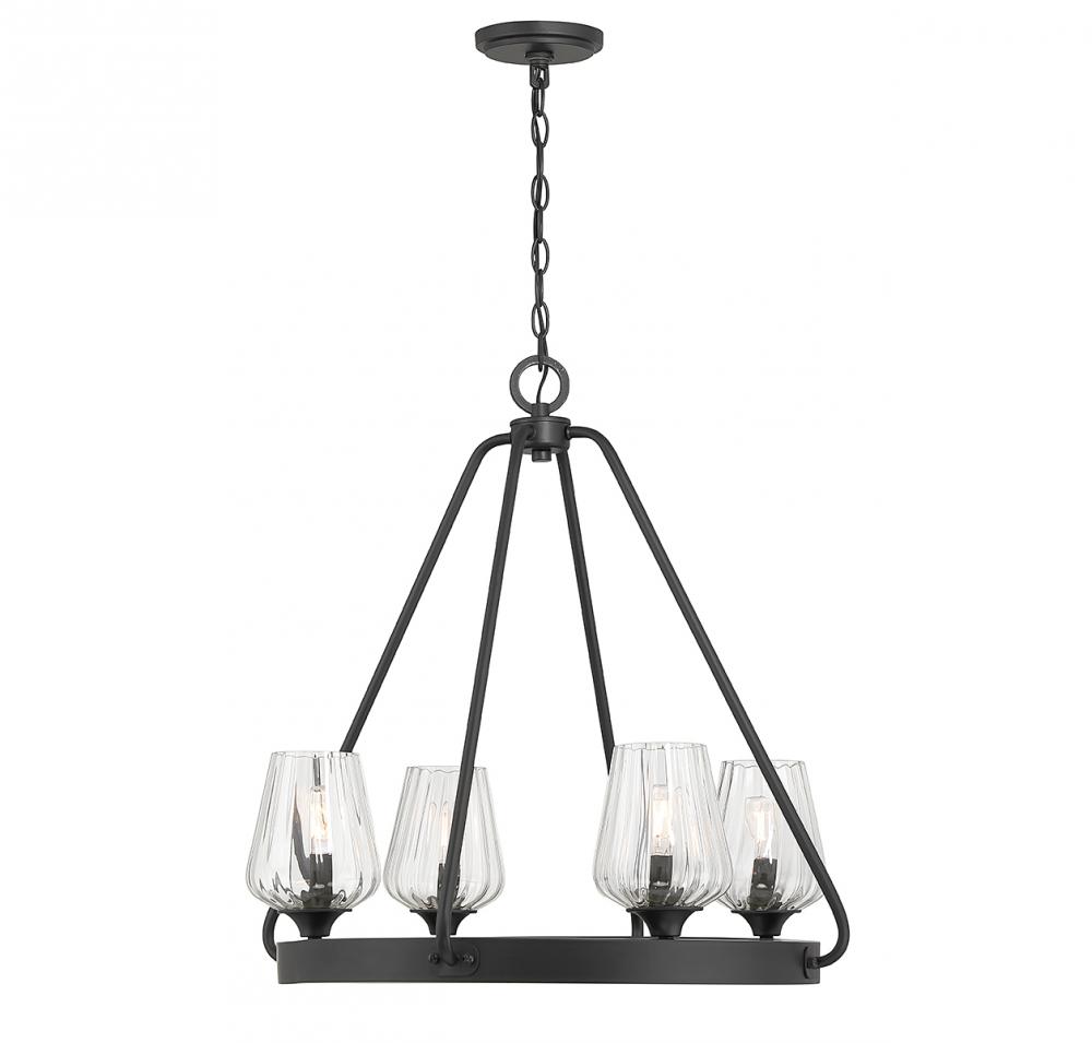 The Savoy House Carlton 4-light chandelier features a beautifully streamlined style highlighted by shades of ribbed glass that give a hint of motion. Finished in matte black. Carlton is 25" in height and 24" in width. Uses 4 candelabra size bulbs with a max of 60 watts per bulb (bulbs not included).