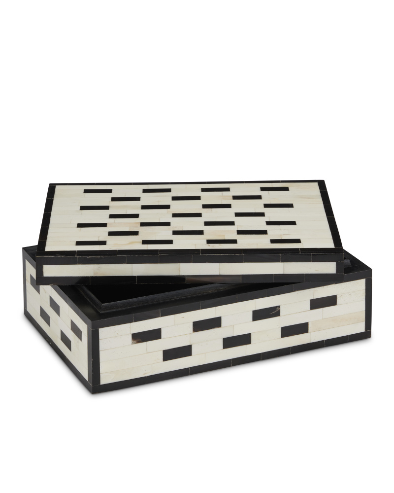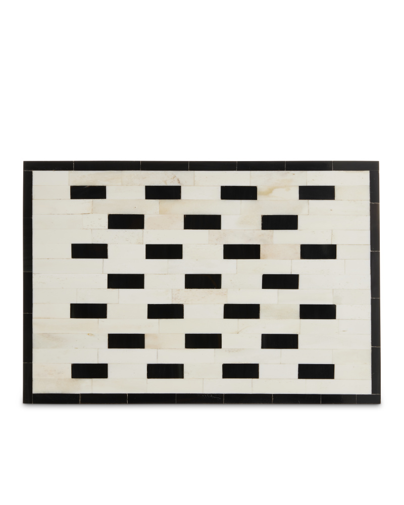 The Carmine Box is sophisticated enough to instantly become a family heirloom passed from generation to generation because the entire decorative accessory is made of valued natural materials. The white rectangles affixed to the surface of the black and white box are made of camel bone while the black rectangles are made of horn. The fact that these are applied to solid wood construction ensures the Carmine is sturdy enough to be passed from household to household.