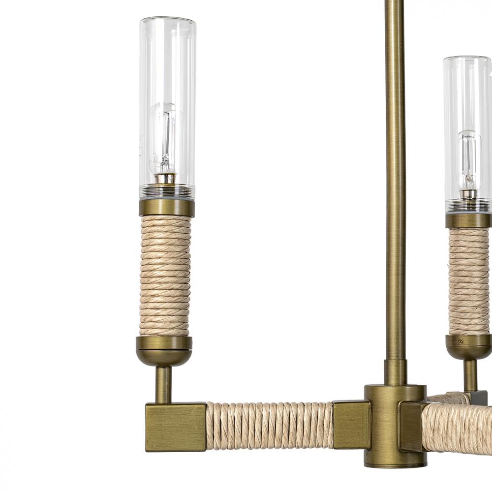 Fully adjustable chandelier features all-weather synthetic rattan hand-twisted and wrapped over brass-finished metal. Weave is resistant to cracking, peeling, fading and breaking. Sockets are enclosed in glass globes for protection from water. Suitable fo