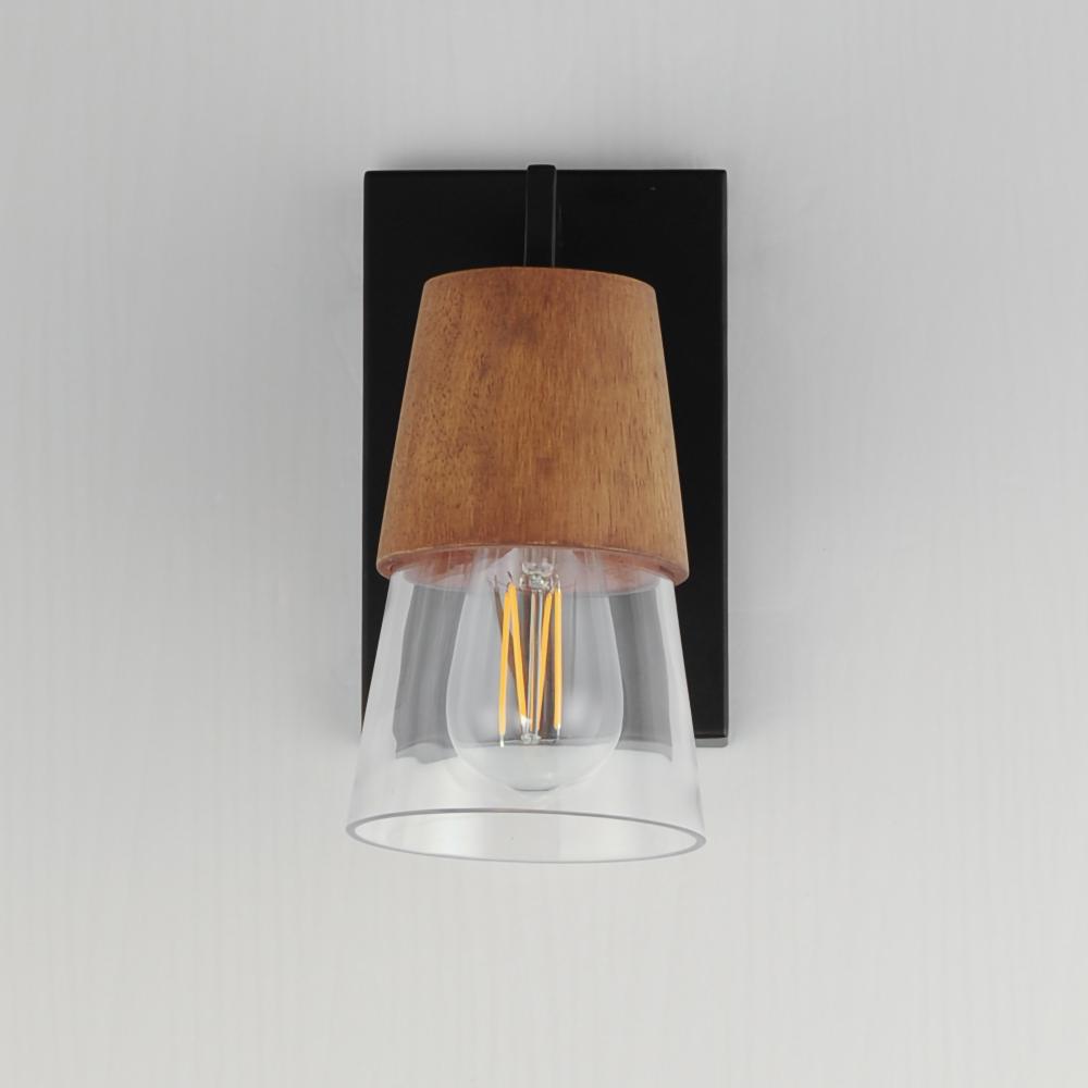 Capped by wood finished in Walnut, this series of bath vanity sconces feature conical Clear Glass shades. Contrasting Matte Black frames of squared tubing add clean geometry to the design. Use decorative lamps in the shades to complete the look.