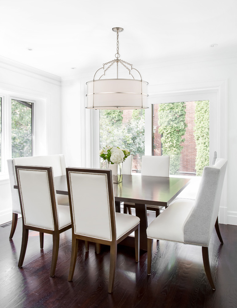 The Carson Collection features a clean linen fabric shade and Polished Nickel (PN) frame that is suspended by decorative chain links. The Polished Nickel (PN) finish contrasts and enhances the warm linen light.