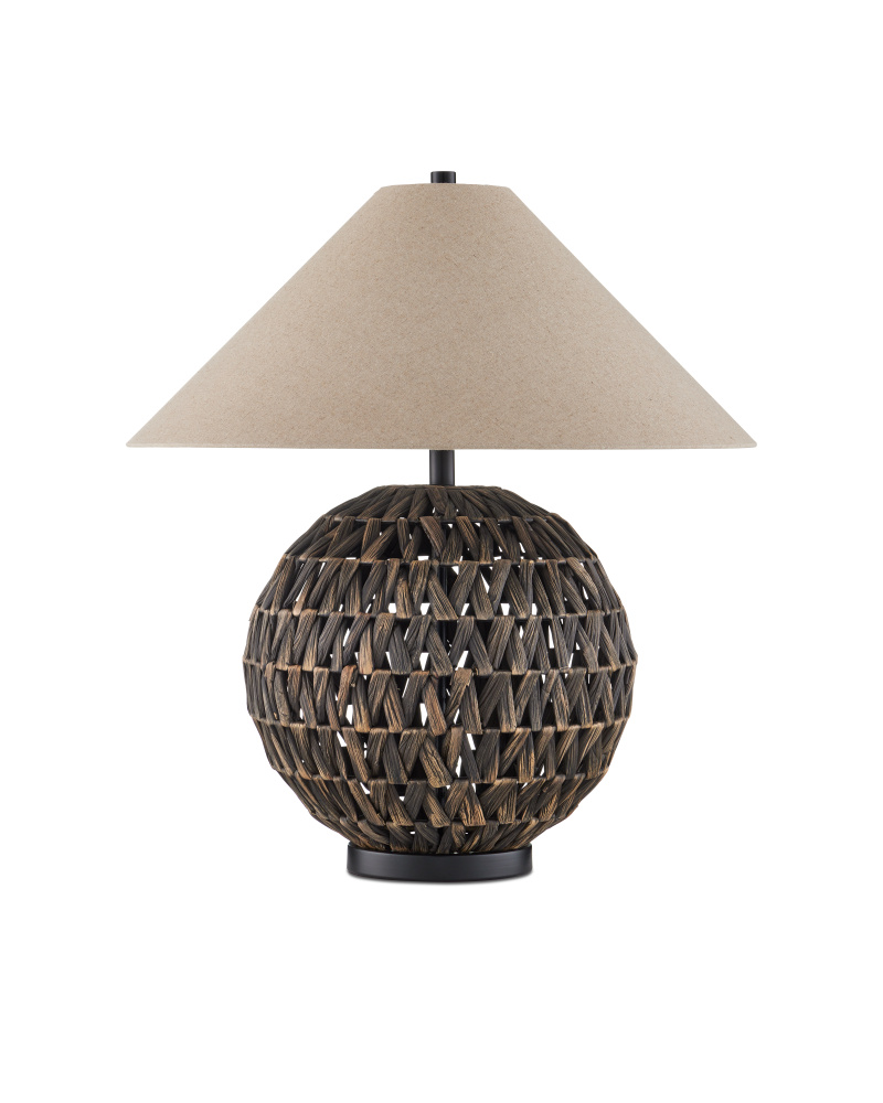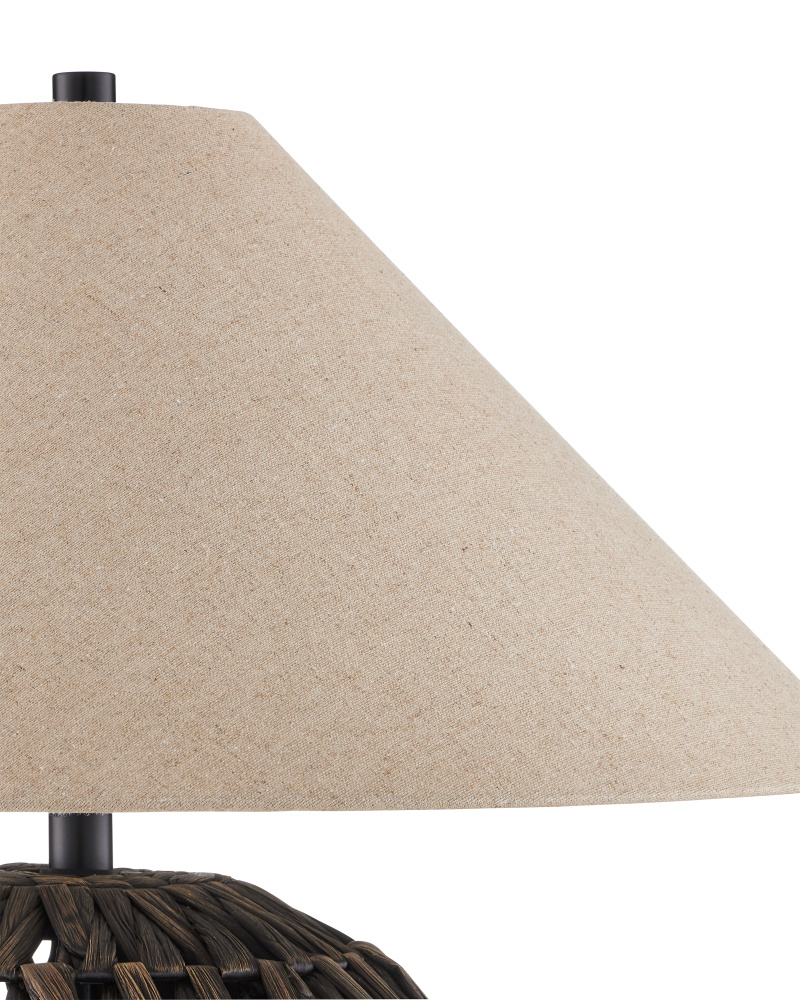 The Casimer Black Table Lamp is a hard-won composition, as water hyacinth is wrapped around wires that create an orb form and washed in black to create depth. The wash soaks into the material more in some spots than in others to create incredible texture. The black base and hardware echoes the darker tones in the natural material, and the empire shade draws out the lighter tones.