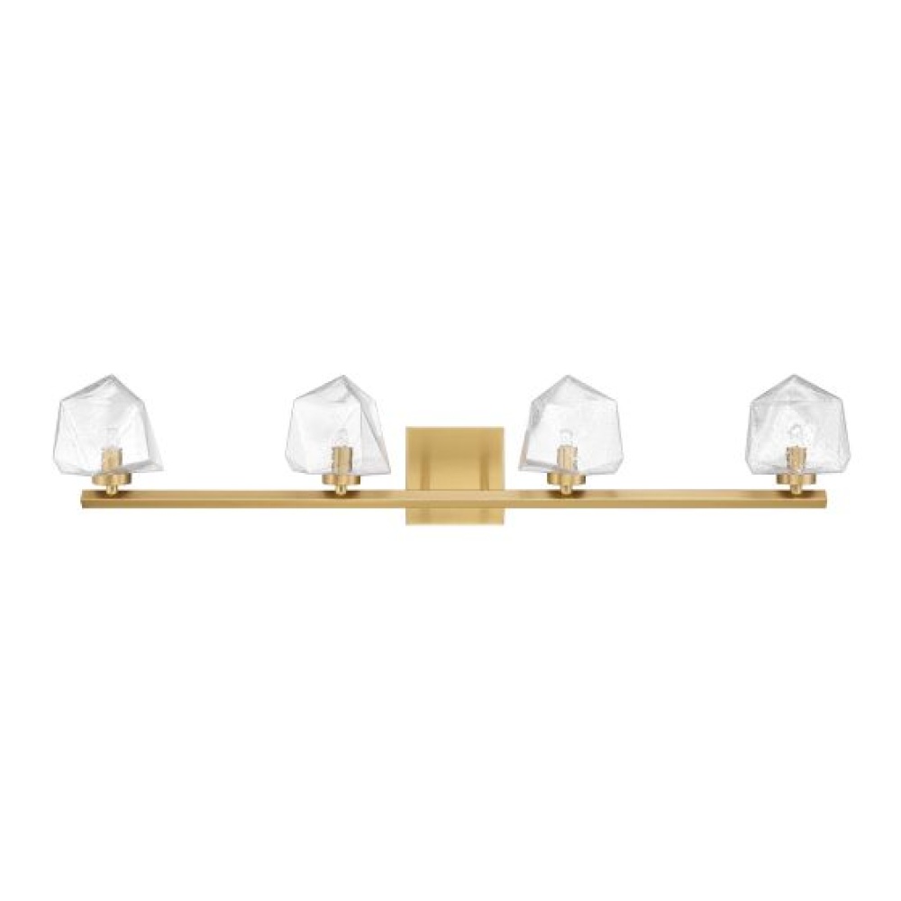 The Castello 4-light bath light from Savoy House is cool as ice! Its sharply cut shades of clear hammered glass add a bright touch of geometry and texture, pairing perfectly with the thick arm and backplate that is finished in Warm Brass. Castello is 6.5" in height, 35" in width and extends 6.5" from the wall. Uses four LED G9 bulbs. Bulbs not included.