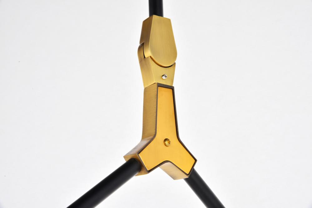 Light antique brass connectors supporting a path of flat black rods