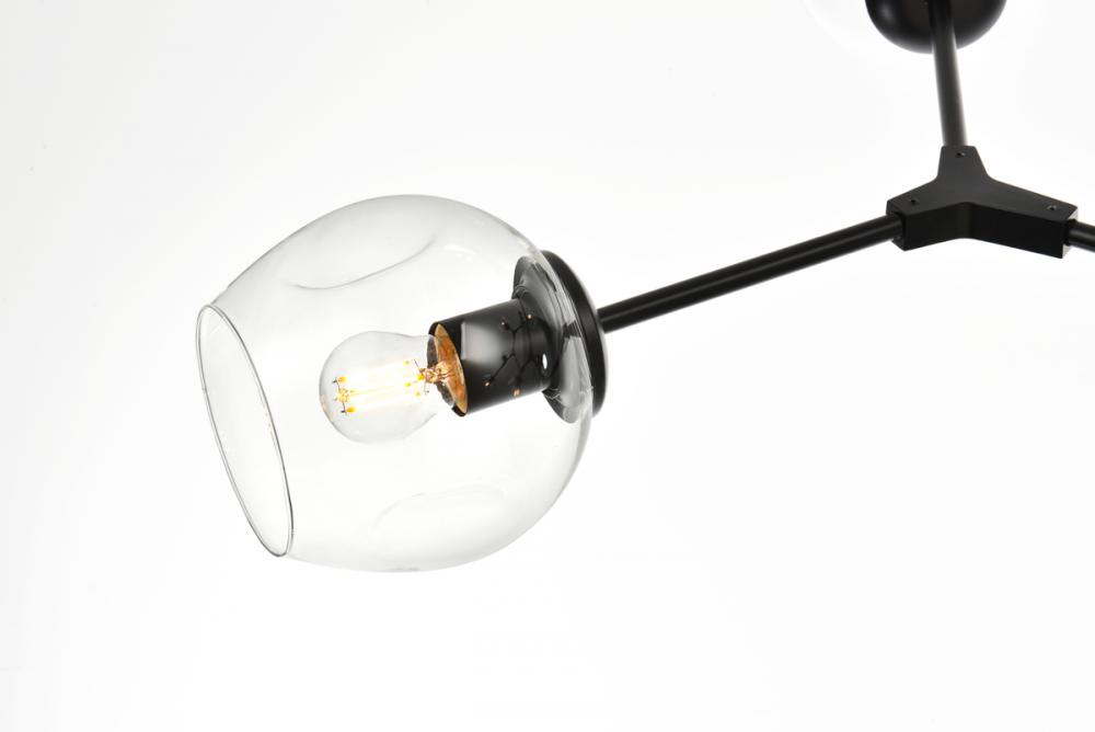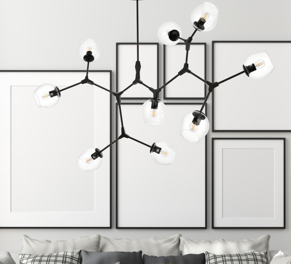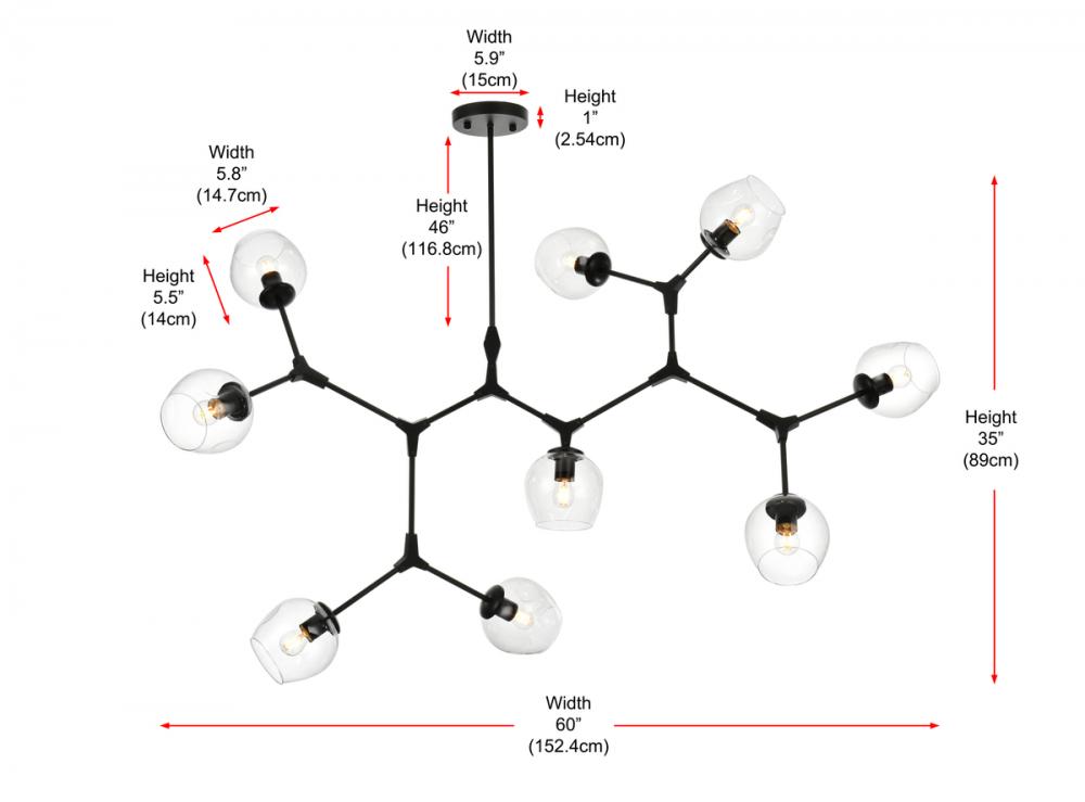 Introducing the Cavoli 60-Inch Chandelier, a perfect fusion of contemporary design and geometric allure. Crafted from durable iron, this visually captivating centerpiece not only adds a sleek modern aesthetic to your space but also ensures a robust and enduring lighting solution. The chandelier holds UL certification, guaranteeing safety and performance adherence. Boasting nine lights with clear glass globe shades, this chandelier offers a stunning visual display, complemented by a dimmable feature for personalized lighting preferences. (Bulbs not included). Illuminate your space with confidence and style.