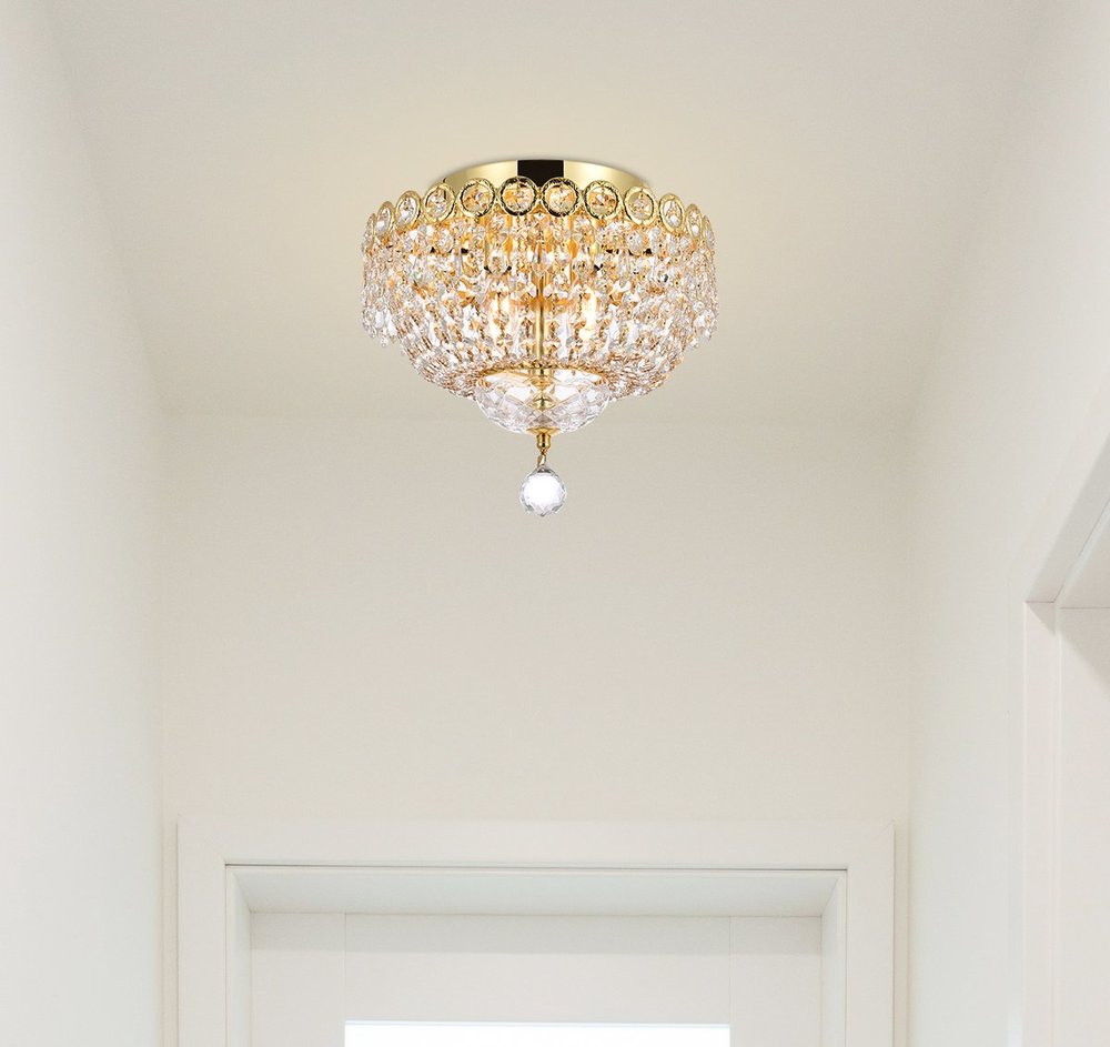 Century collection flush-mount fixtures, inspired by the classic elegance of 19th-century France, offer the versatility and adaptability to add splendor to many areas of your home. The light-refracting hemisphere designs abound in clear crystal octagons and prisms in a wide variety of trims. The candelabra bulbs give off the glowing hue of the frame, finished in gold or chrome.