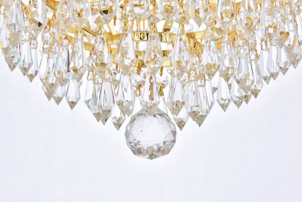 Century collection flush-mount fixtures, inspired by the classic elegance of 19th-century France, offer the versatility and adaptability to add splendor to many areas of your home. The glimmering hemisphere design is ablaze in a profusion of clear crystal octagons and prisms in a wide variety of trims, with the descending tiers all coming together in a Single faceted crystal ball. The candelabra bulbs give off the glowing hue of the frame, finished in gold or chrome.