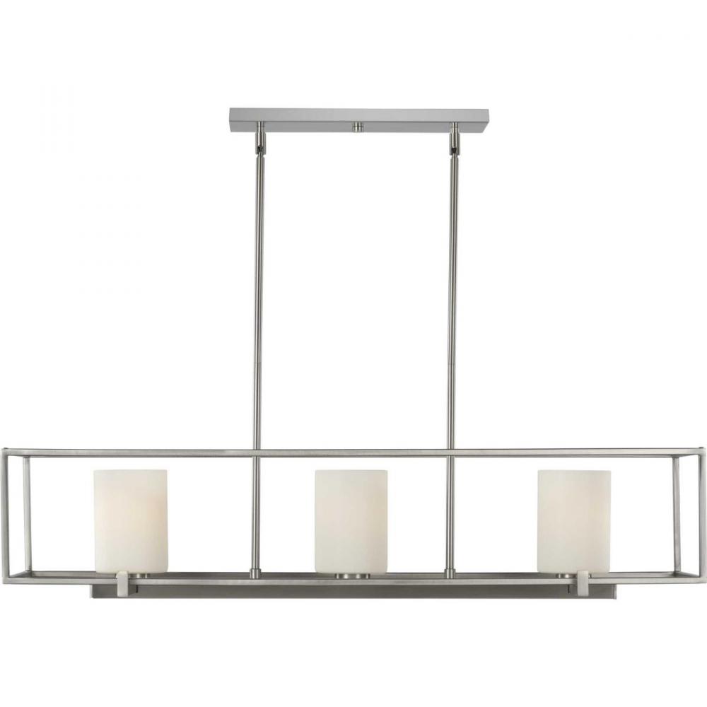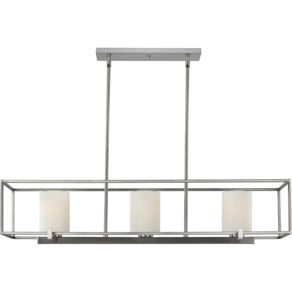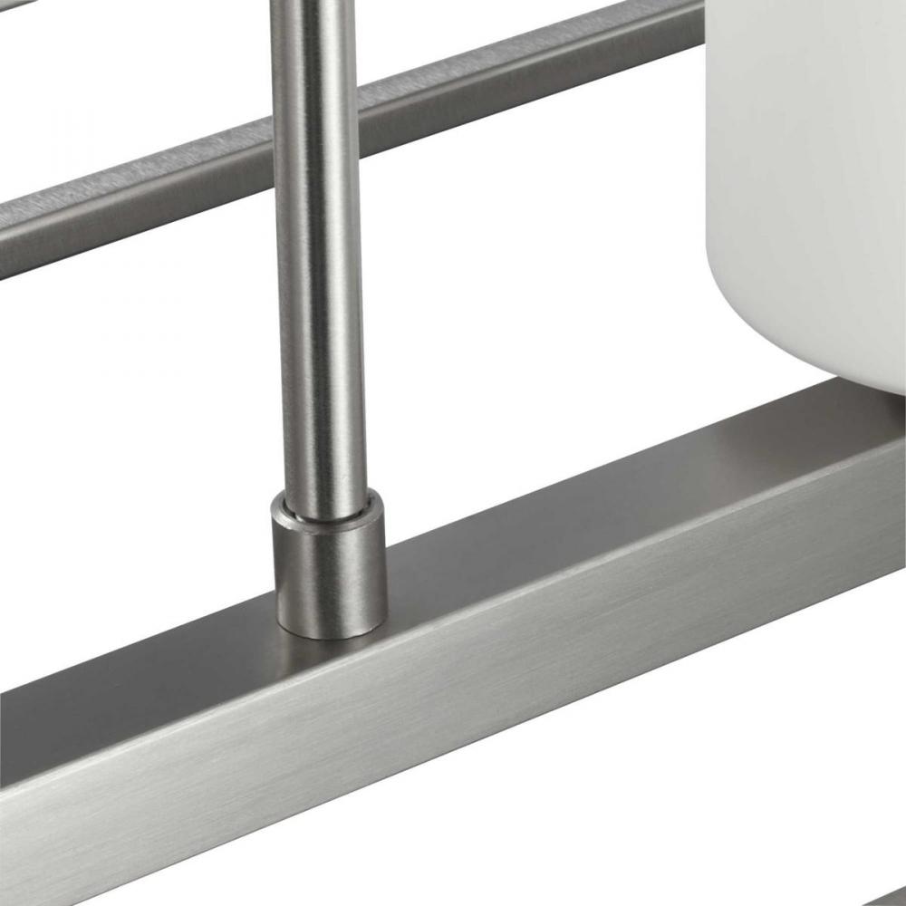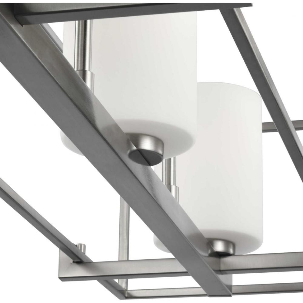 Beautiful opal glass shades visually calm the sharp edges of the boxy frame in a masterful stroke of design excellence.;The frame is coated in a classic brushed nickel finish that contrasts the light shades.;The light fixture is just right for spaces in ne