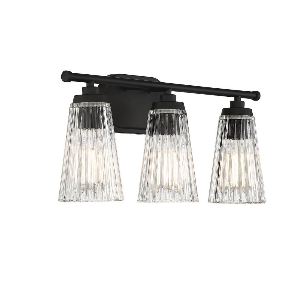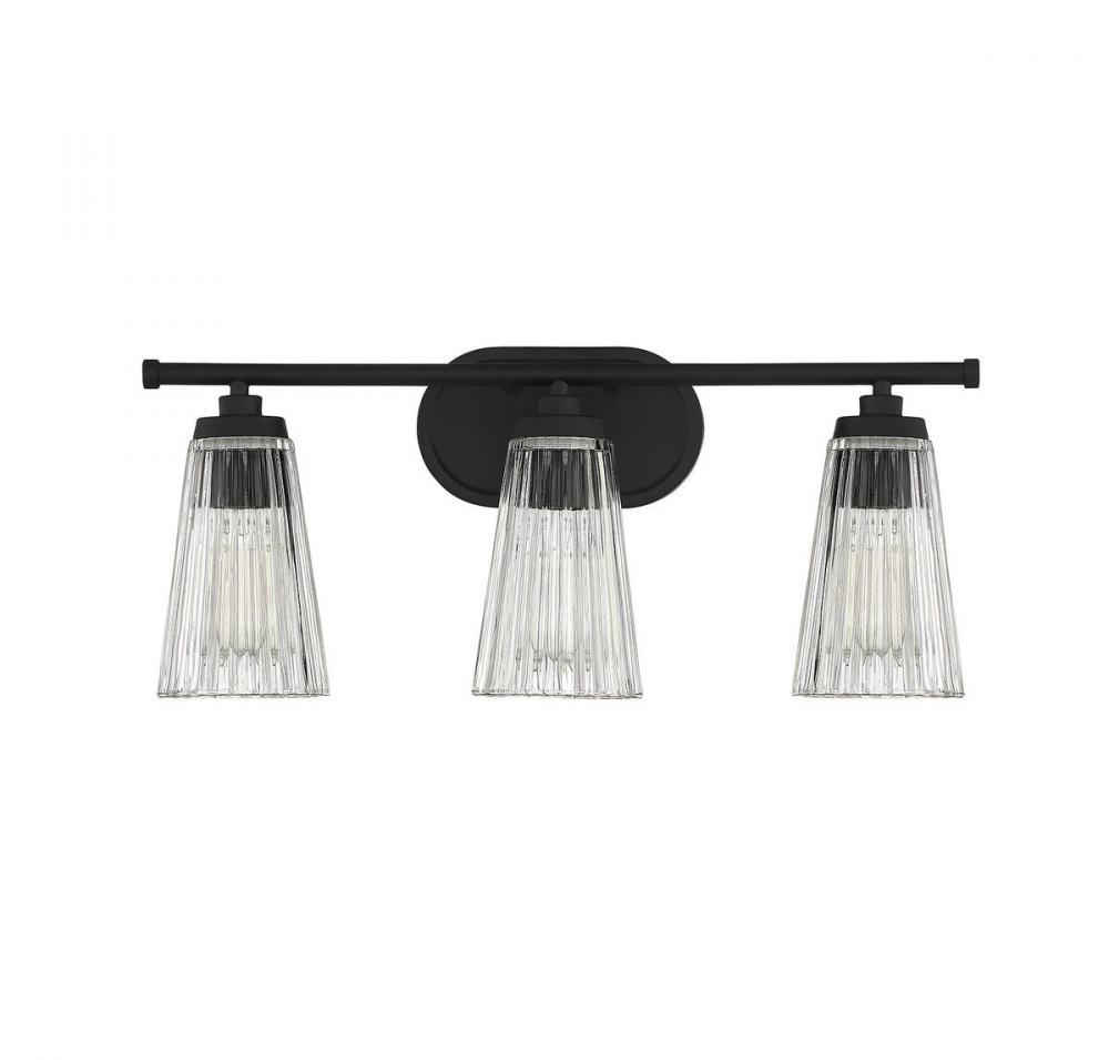 Textured, eye-catching shades of clear ribbed glass take center stage in the Chantilly 3-light bathroom vanity light from Savoy House. Finished in matte black. Chantilly is 10" in height and 22" in width. It extends 7" from the wall. Uses three standard size bulbs of up to 60 watts per bulb. Damp area rated.