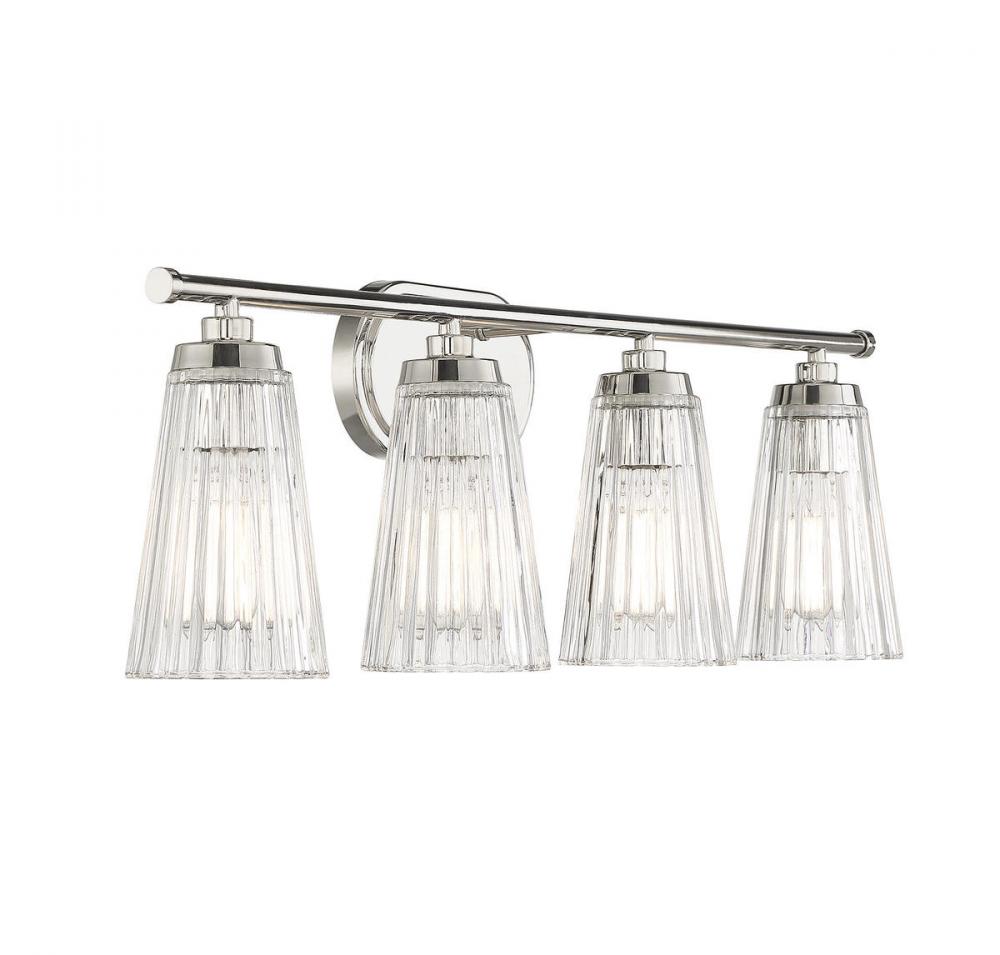 Textured, eye-catching shades of clear ribbed glass take center stage in the Chantilly 4-light bathroom vanity light from Savoy House. Finished in polished nickel. Chantilly is 10" in height and 30.5" in width. It extends 7" from the wall. Uses four standard size bulbs of up to 60 watts per bulb. Damp area rated.