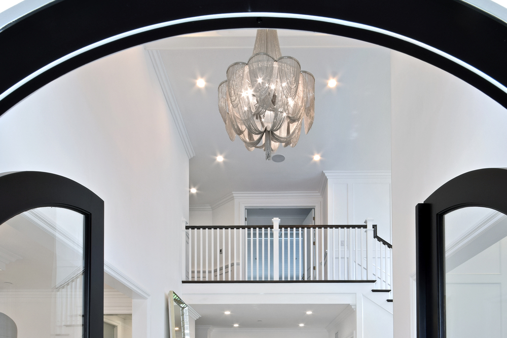 Chantilly collection features metal frames gracefully draped with Nickel finished jewelry chain. Metal trim rings of Polished Nickel add sharp contrast to the softness of the chain, which conceals the xenon light source.