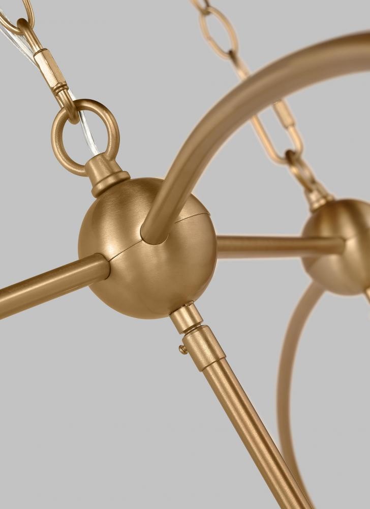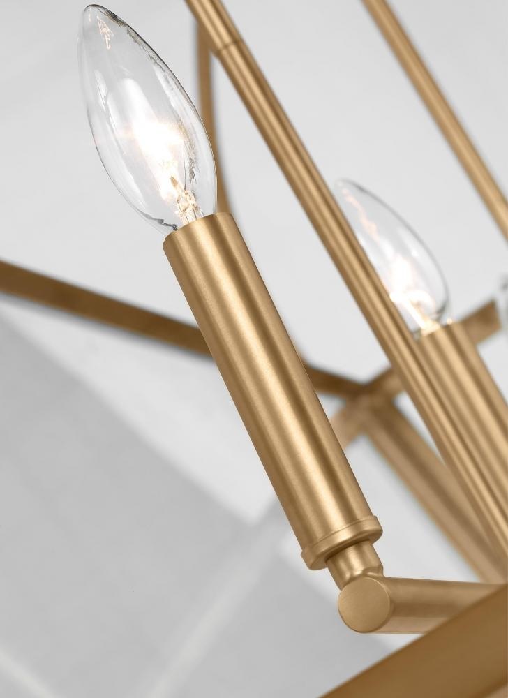 The Charleston four light indoor pendant in satin brass provides abundant light to your home, while adding style and interest. A lantern-like design with curved arms connecting to a cube-shaped frame