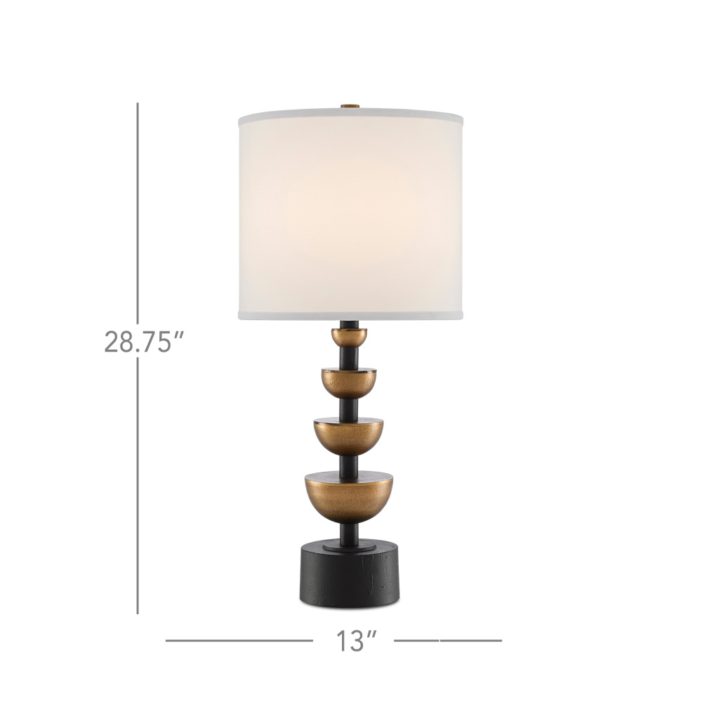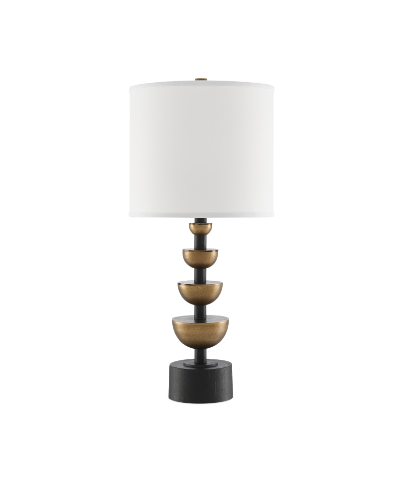A study in contrasts, our Chastain Table Lamp fuses round shapes with flat planes and gleaming surfaces with matte darkness. Made of cast aluminum that we have treated to a mix of antique brass and black finishes, the lamp holds halved orbs set along the stem that grow as they flow downward. Topping this complex composition is an off-white shantung shade.