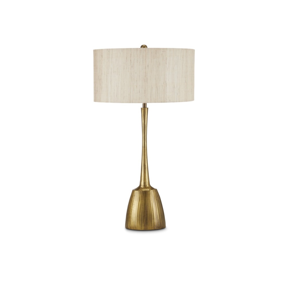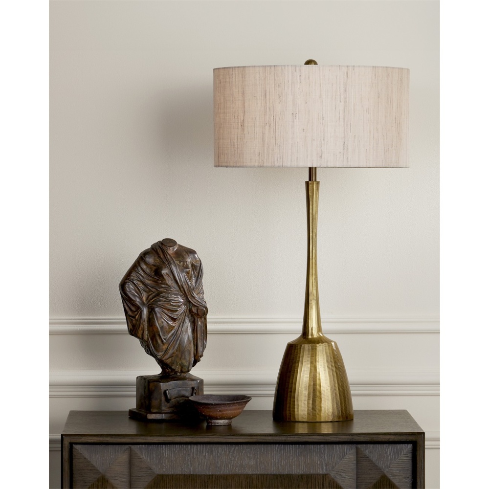 A nod to brutalist style with a gleaming antique brass finish, the Cheenee Table Lamp has a powerful silhouette. The gold table lamp has a long neck that subtly narrows in the middle, and the entire composition is striated with chisle marks in between the lines to bring added texture to the sculptural profile. Adding to this is the natural linen shade with its subtle striations.