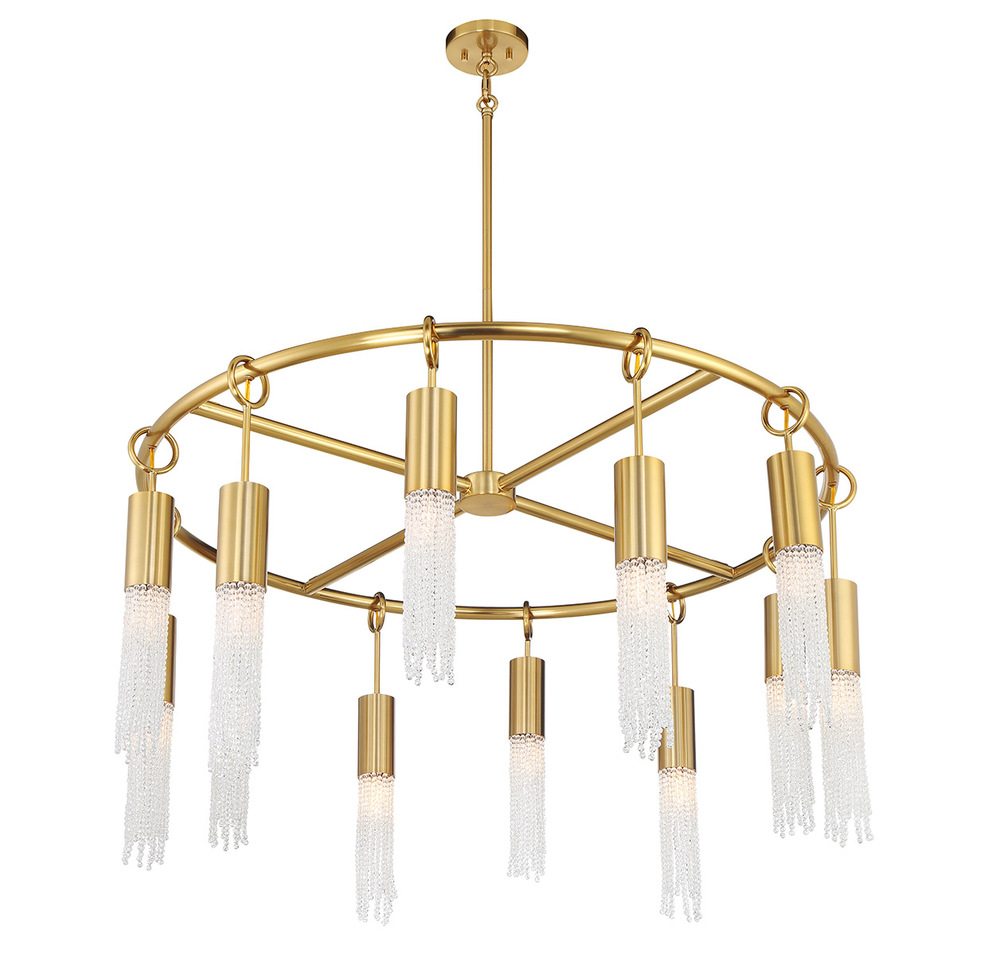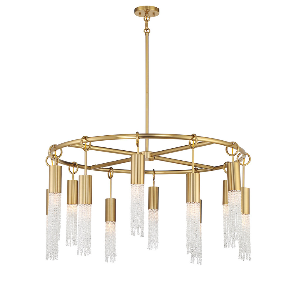The Savoy House Chelsea 12-light chandelier brings understated elegance and sparkle to your home. Each light socket, finished in beautiful Warm Brass, is adorned with cascading strands of clear crystal beads that amplify the shimmer and shine. Chelsea is 40" in width and has an adjustable height ranging from 20.5" to 74.5". It comes with four 12" downrods and one 6" downrod. Uses twelve standard size bulbs of up to 60 watts per bulb. Bulbs not included.
