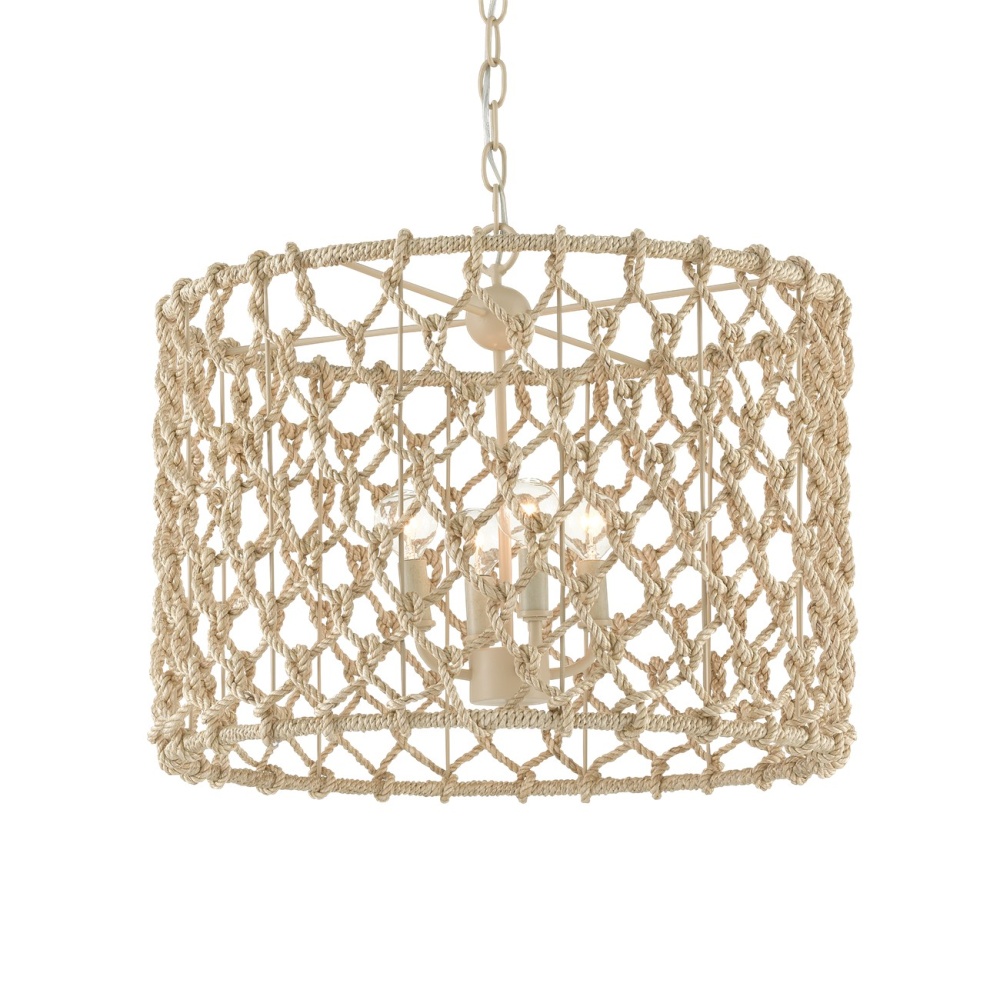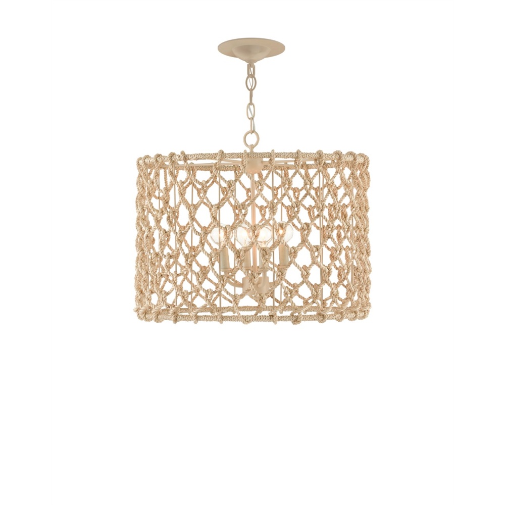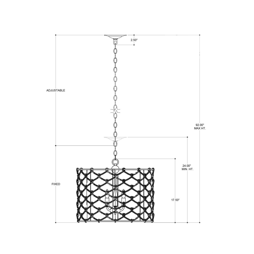 Made of wrought iron in a smoke wood finish and natural abaca rope, the Chesapeake Chandelier is a drum chandelier with an open and airy feel thanks to the loose looping of the material between the top and bottom rings of the shade. The nautical chandelier illustrates the skill of our artisans, as the rope is hand-knotted and hand-tied to the frame, painstaking efforts that result in an artisanal light fixture. Adjustable from 24" to 92" with use of included chain/rod kit/cable. If your space calls for a longer drop, additional chain/rods/cable is available for purchase.
