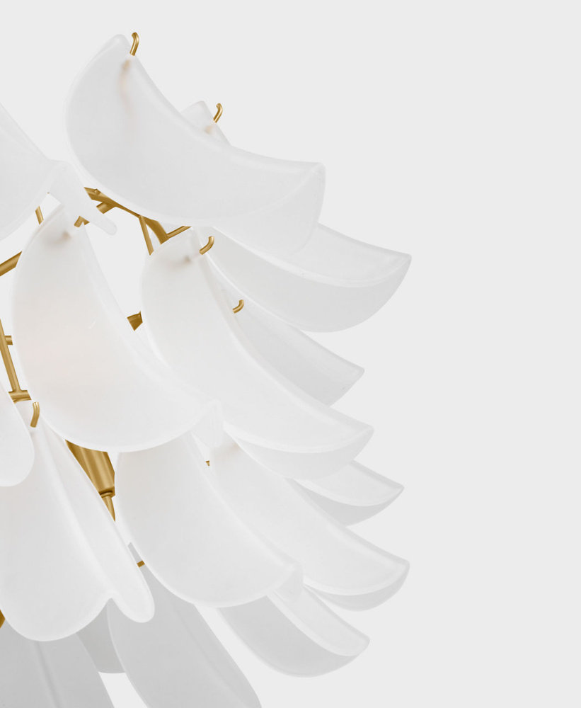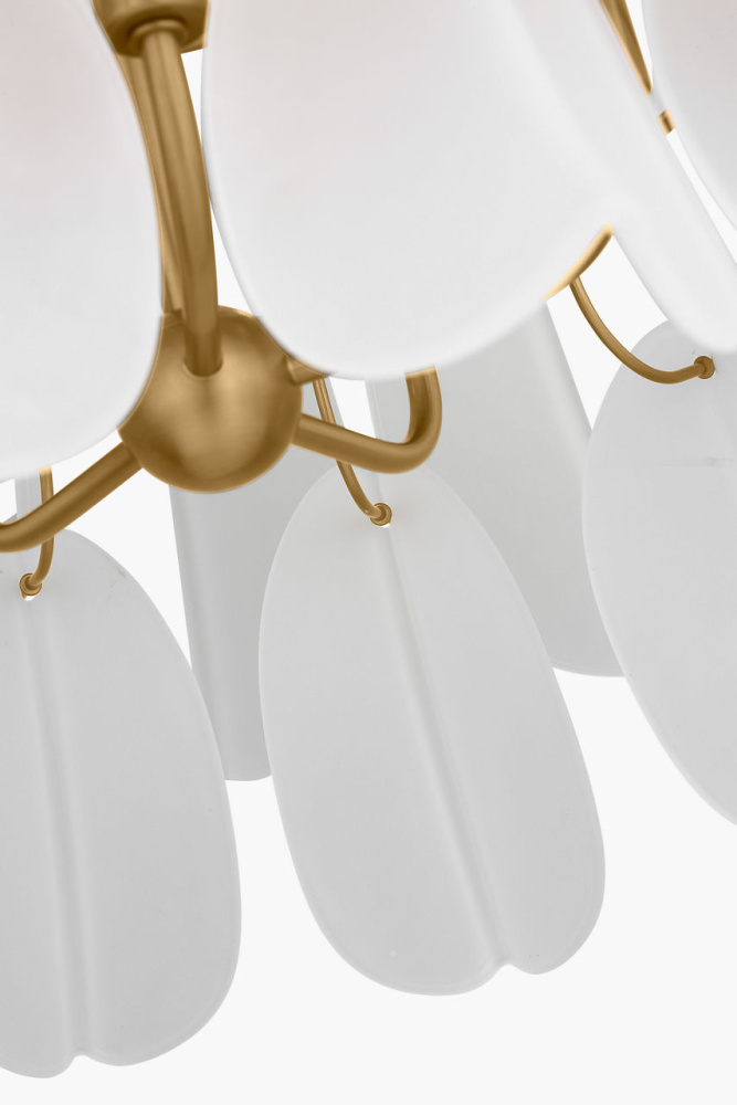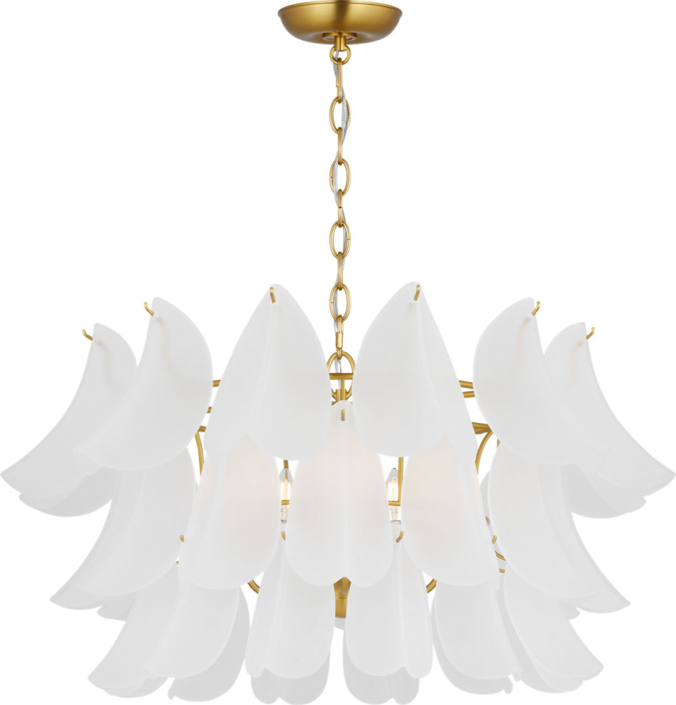 The Chloe 32" Chandelier by Chapman & Myers brings sculptural elegance and botanical inspiration to larger interior spaces. Drawing from the delicate forms of flower blossoms, this statement piece features tiers of custom white glass petals crafted from white cased glass—softening the light and creating a gentle, ambient glow. At 32", its scale and layered silhouette make it ideal for dining rooms, living rooms, foyers, and bedrooms, where its organic form and refined craftsmanship serve as a visual centerpiece. As part of the Chloe Collection, it balances natural beauty With architectural clarity, offering a chandelier that feels both expressive and timeless.