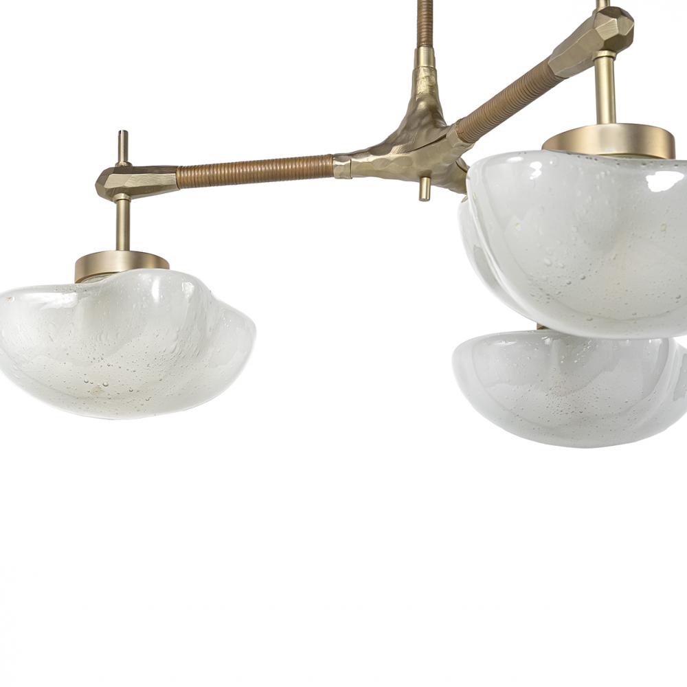 Fully adjustable chandelier with hand-wrapped taupe rattan over a forged textured brass frame in a champagne finish features hand-crafted, organic shaped frosted glass. Adjustable rods and canopy hanging kit includes 1 x 18" rod, 2 x 12" rods, 1 x 6" rod