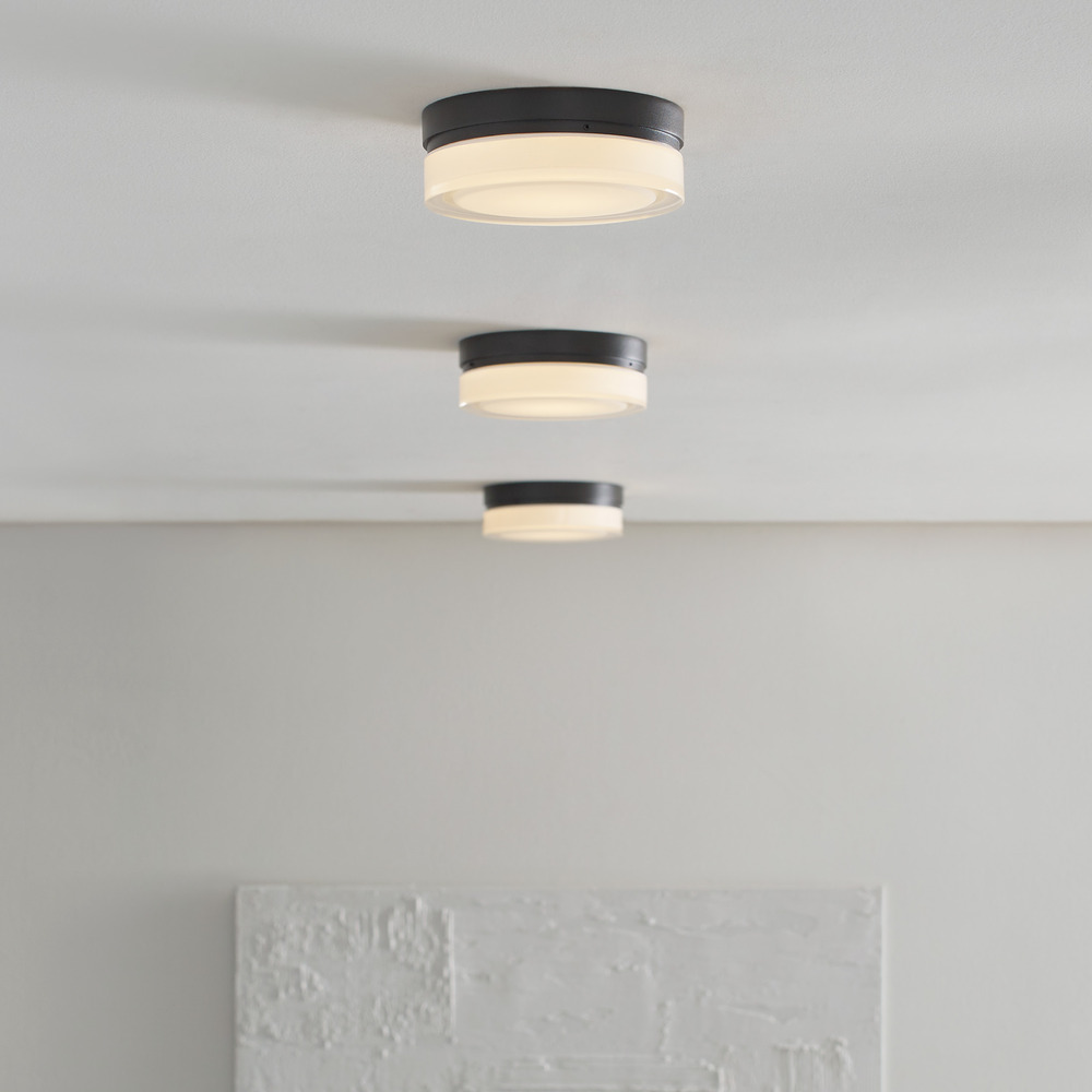 The Cirque ceiling fixture by Sean Lavin features a simple and clean design with its beautiful round pressed glass shade is and hand polished exterior. A metal base made of die-cast metal frames the glass giving this feature a very handsome look. Available in modern finishes. Your choice of LED lamping ships with Cirque saving you time and money. Lamping options are compatible with most dimmers. Refer to Dimming Chart for more information.