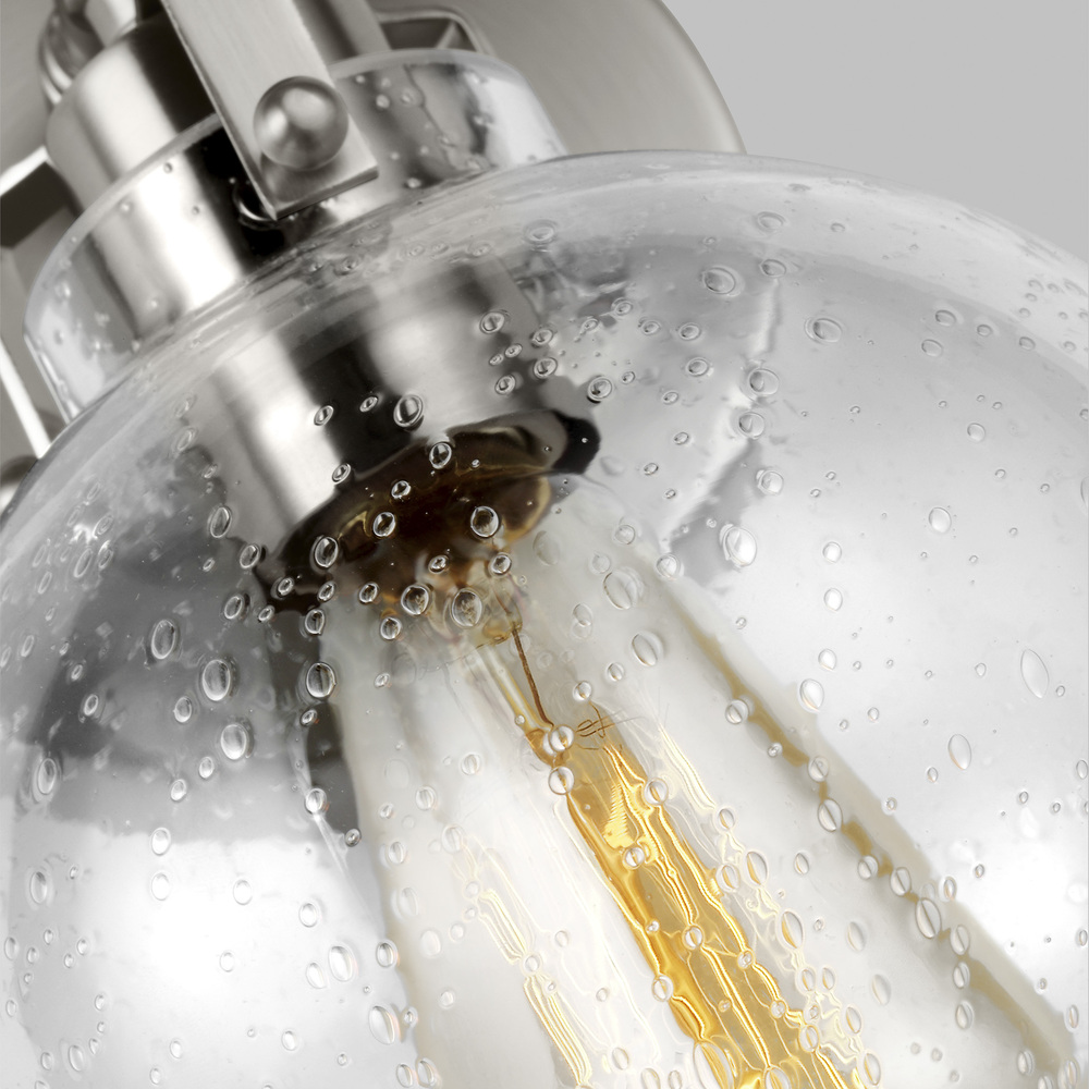 Clara features Clear Seeded glass shades that subtly diffuse the lamping while allowing the exposed bulb to be a central design element of the fixture. Choose the look that is right for your space with four finish options: Burnished Brass, Chrome, Satin Nickel, Oil Rubbed Bronze or a two-toned finish of Textured Black with Chrome.