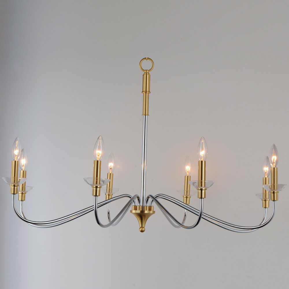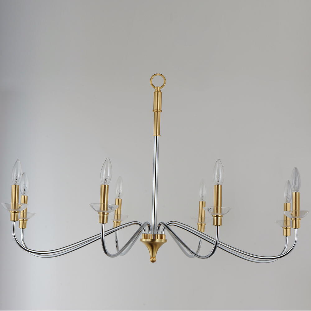 Combination of contemporary Polished Chrome and a softer Satin Brass revitalizes a classic form. Glass bobeches complete the look creating an airy and simple chandelier group. Get that casual luxe look with minimalistic, transitional forms.