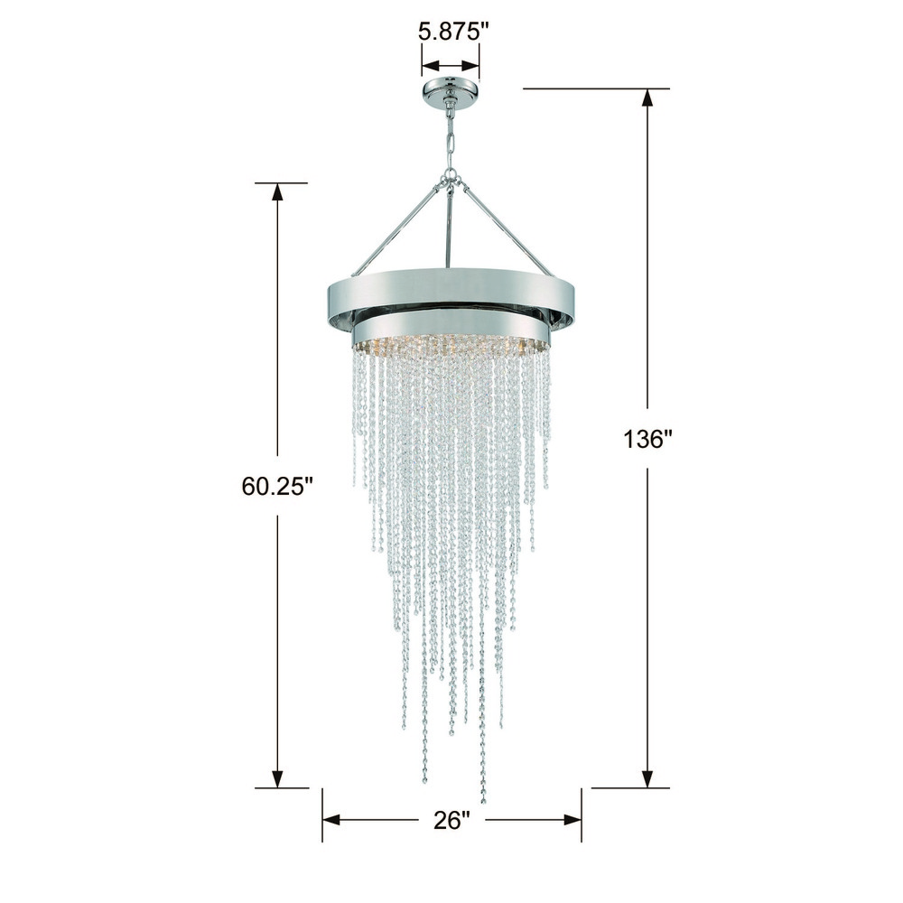 Cascading waterfall of faceted crystal strands are suspended from a polished nickel metal frame creating a dramatic statement in any room. The robust layering of crystals is a brilliant focal point for dressing up modern or contemporary interiors.