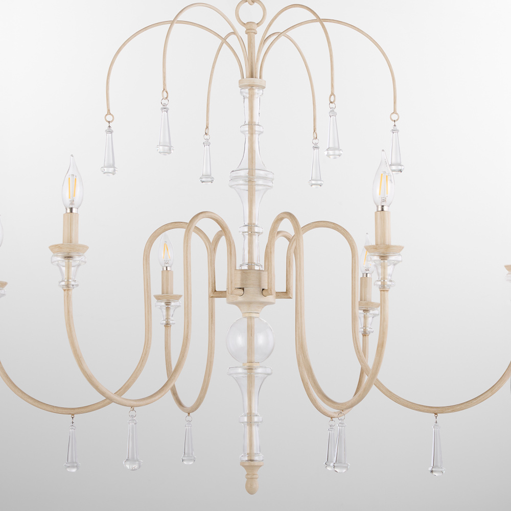 Clasica brings European-inspired elegance to any space with its romantic and traditional design. The washed oak finish works seamlessly with the shaped glass detail. Its soft, weathered tones complement the smooth, sculpted form, creating a delicate and distinguished look. Bold glass crystals hang from the arms, adding a touch of luxurious brilliance that enhances the fixture’s elegant silhouette. Available in multiple light configurations to suit a variety of settings.