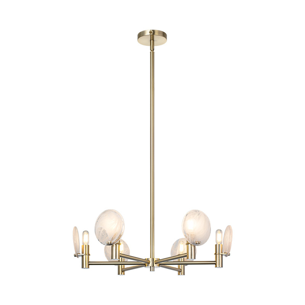 This chandelier blends mid-century modern with space-age sophistication ideal for upscale dining rooms, creative studios, or hospitality spaces aiming for an artistic edge.This can be shown with the light emitting up or down.The cloudy swirl glass gives it a soft touch to the design.