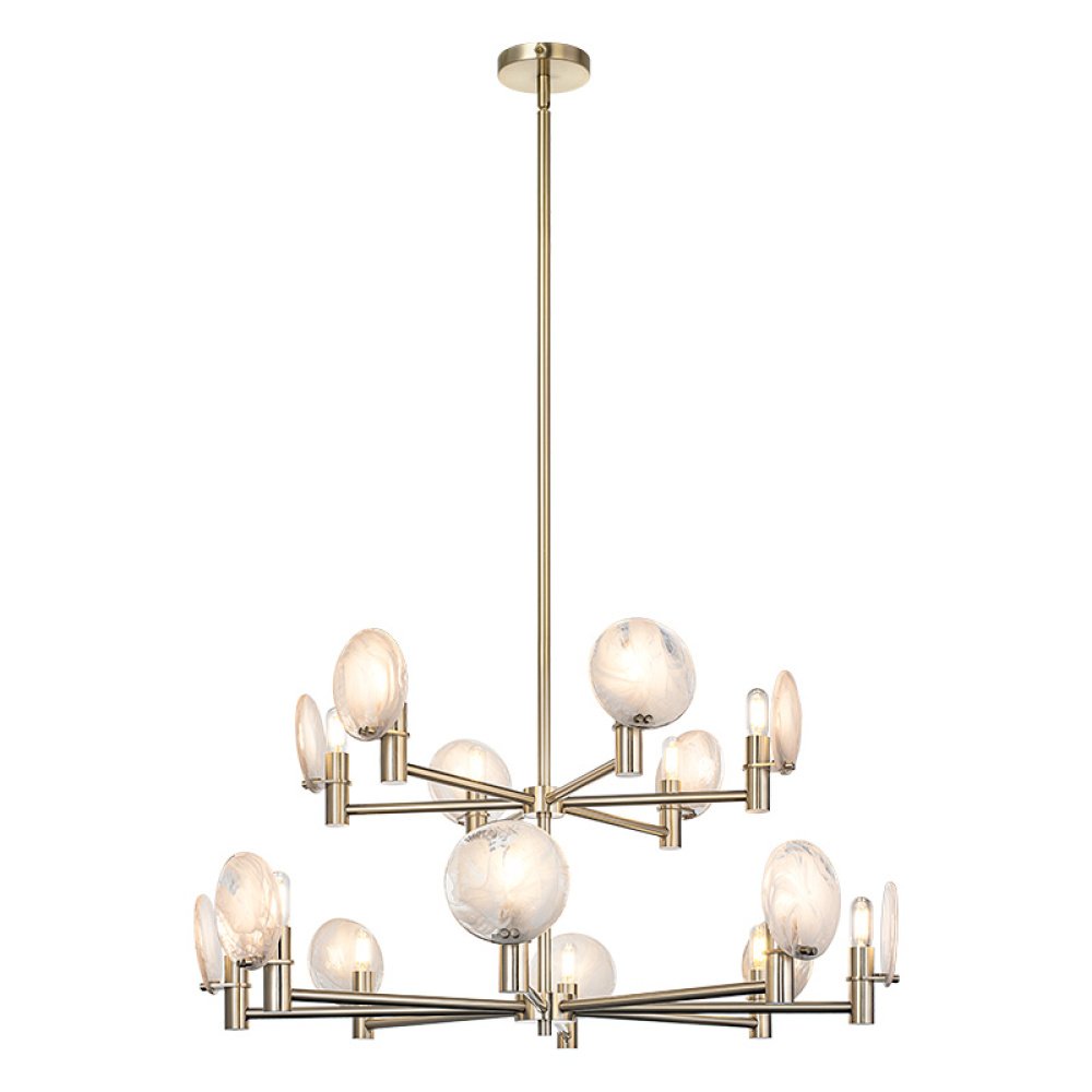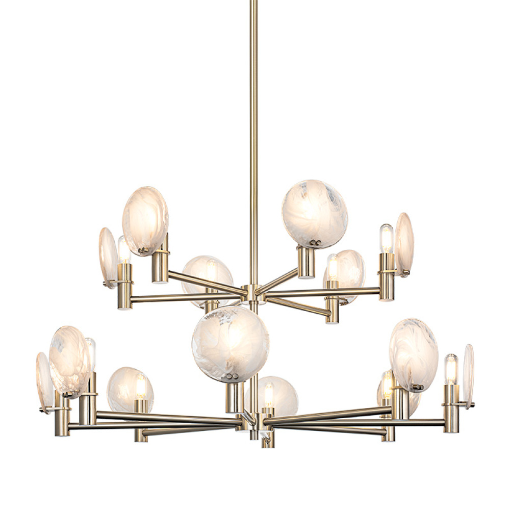 This chandelier blends mid-century modern with space-age sophistication ideal for upscale dining rooms, creative studios, or hospitality spaces aiming for an artistic edge.This can be shown with the light emitting up or down.The cloudy swirl glass gives it a soft touch to the design.