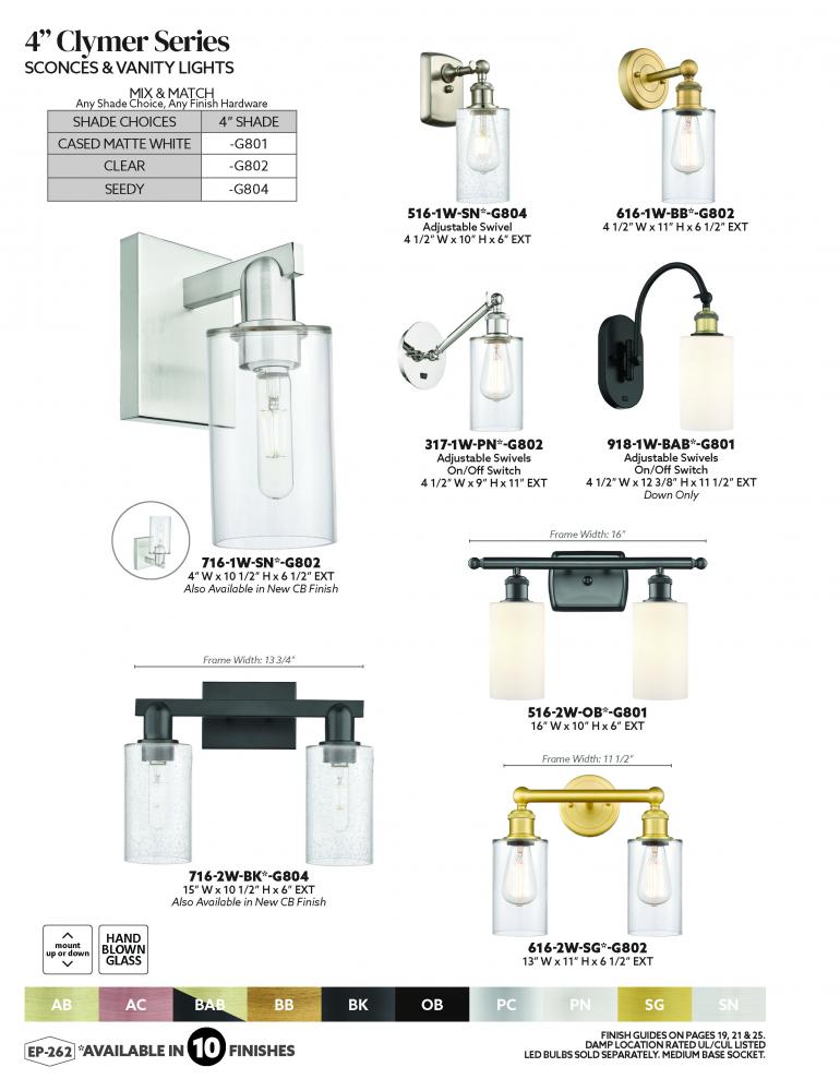 White & Clear heavy glass cylinders and a large selection of frame finishes allow the Clymer series to match any decor.