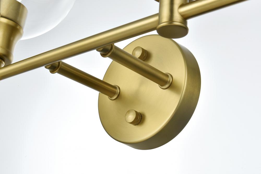 Add a touch of contemporary style to your space with this versatile wall sconce. Available in satin gold, chrome, black, and brass finishes, this fixture complements any decor, from modern to classic. The wall sconce showcases a pair of glass globe shades, available in clear or frosted white that deliver a bright, ambient glow, whether mounted upwards or downwards. Crafted from durable iron and glass, it combines robustness with a sleek style. The clean lines of the round backplate and horizontal arm create a modern yet timeless look. Designed for hardwired installation, this fixture uses E26 standard sockets, allowing you to choose the perfect bulbs for your desired ambiance. This wall sconce is ready to elevate any room with its unique combination of functionality and contemporary design.