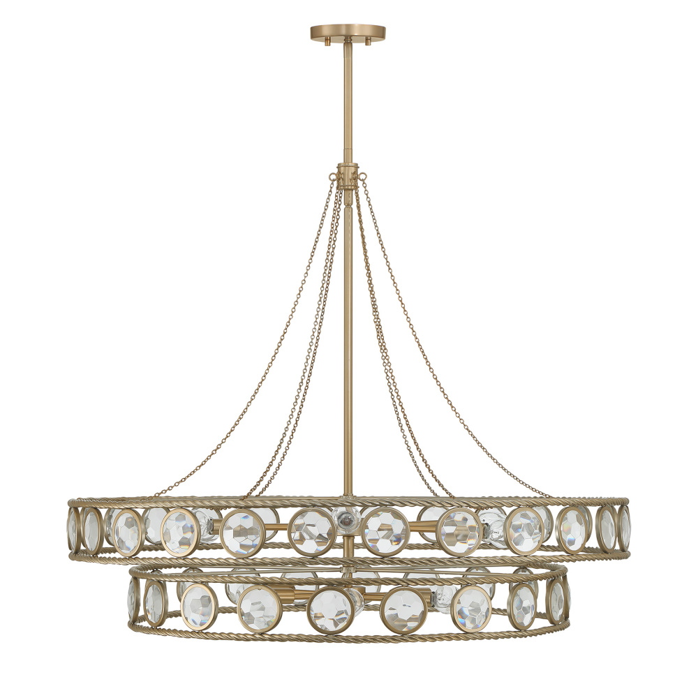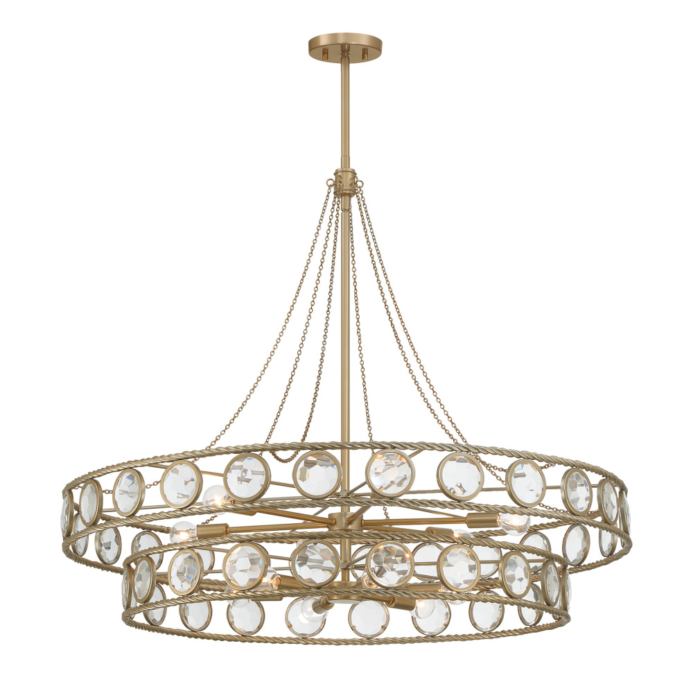Double the drama with the Cologne 12-light pendant. This two-tiered wagon-wheel form holds clear, faceted glass disks trimmed with braided-rope detail, creating a combination that brings jewelry-inspired glamour into any space. The Opulent Gold finish enhances every angle, ensuring a radiant impression day or night. Cologne is 38" wide and adjustable from 32" to 86" in height. Uses twelve candelabra size bulbs of up to 60 watts per bulb (not included). Includes four 12" downrods and one 6" downrod.
