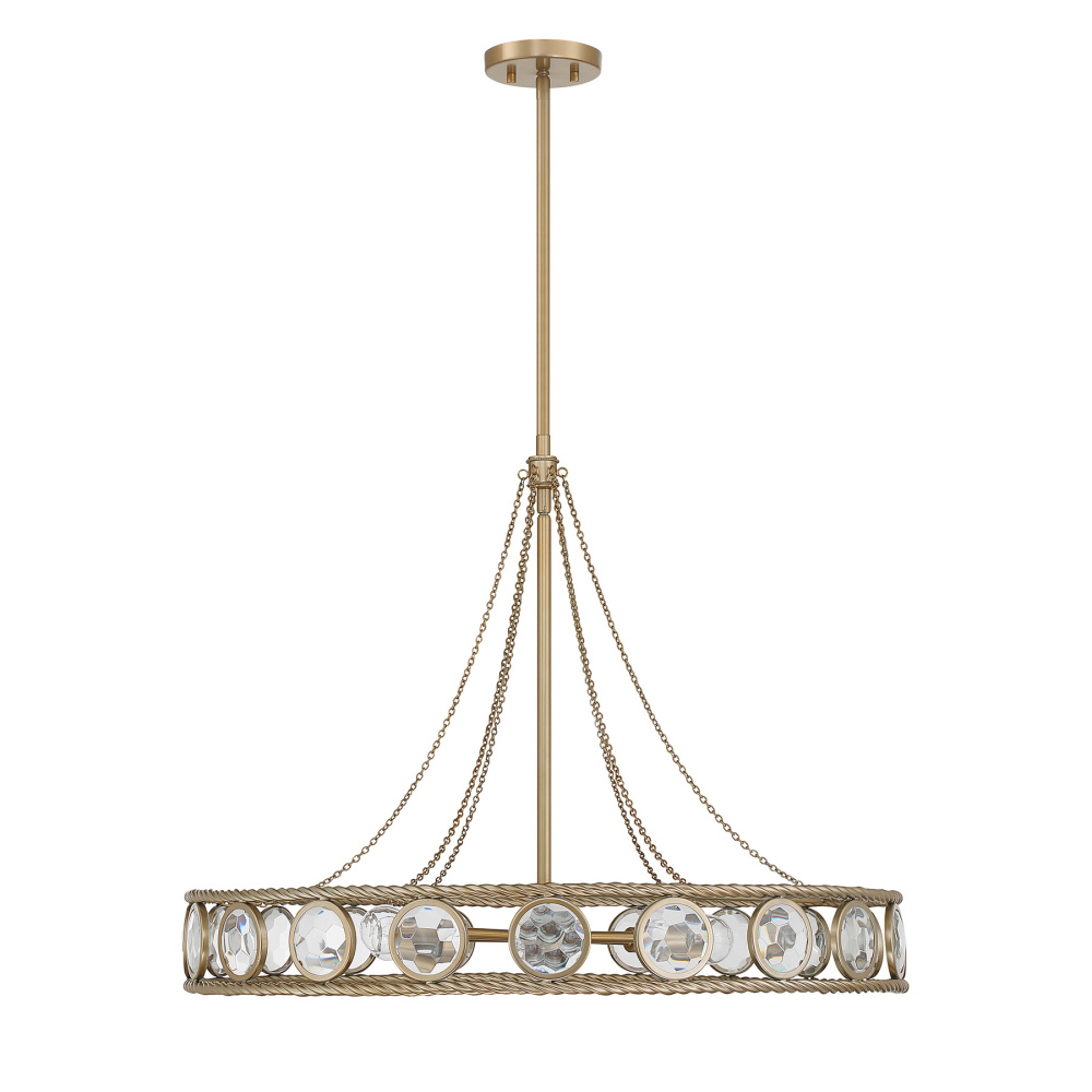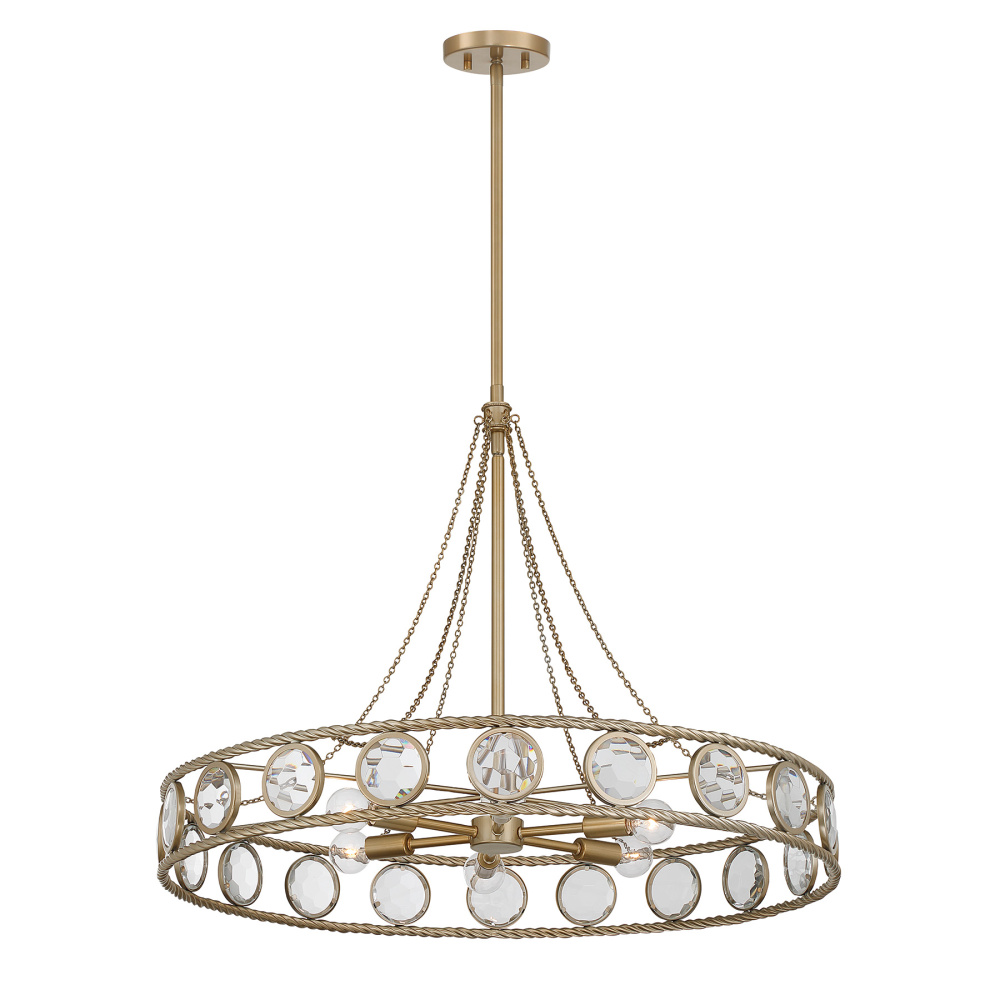 Give your room a dose of brilliance with the jewel-like Savoy House Cologne 6-light pendant. Its open wagon-wheel silhouette showcases clear glass disks carved with bold geometric facets and wrapped in intricate braided-rope detailing, all shimmering with an Opulent Gold finish. Whether the lights are on or off, Cologne brings instant sparkle and presence. It is 30" wide and adjustable from 23" to 77" in height. Uses six candelabra size bulbs of up to 60 watts per bulb (not included). Includes four 12" downrods and one 6" downrod.