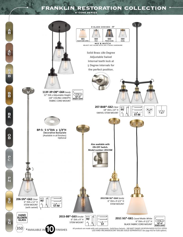 The Franklin Restoration collection is comprised of heavy cast components that give the fixture a heavy Industrial look and feel. We offer the fixture in 10 finishes with a Bare Bulb look or with over 100 possible metal and glass shade options that can cha