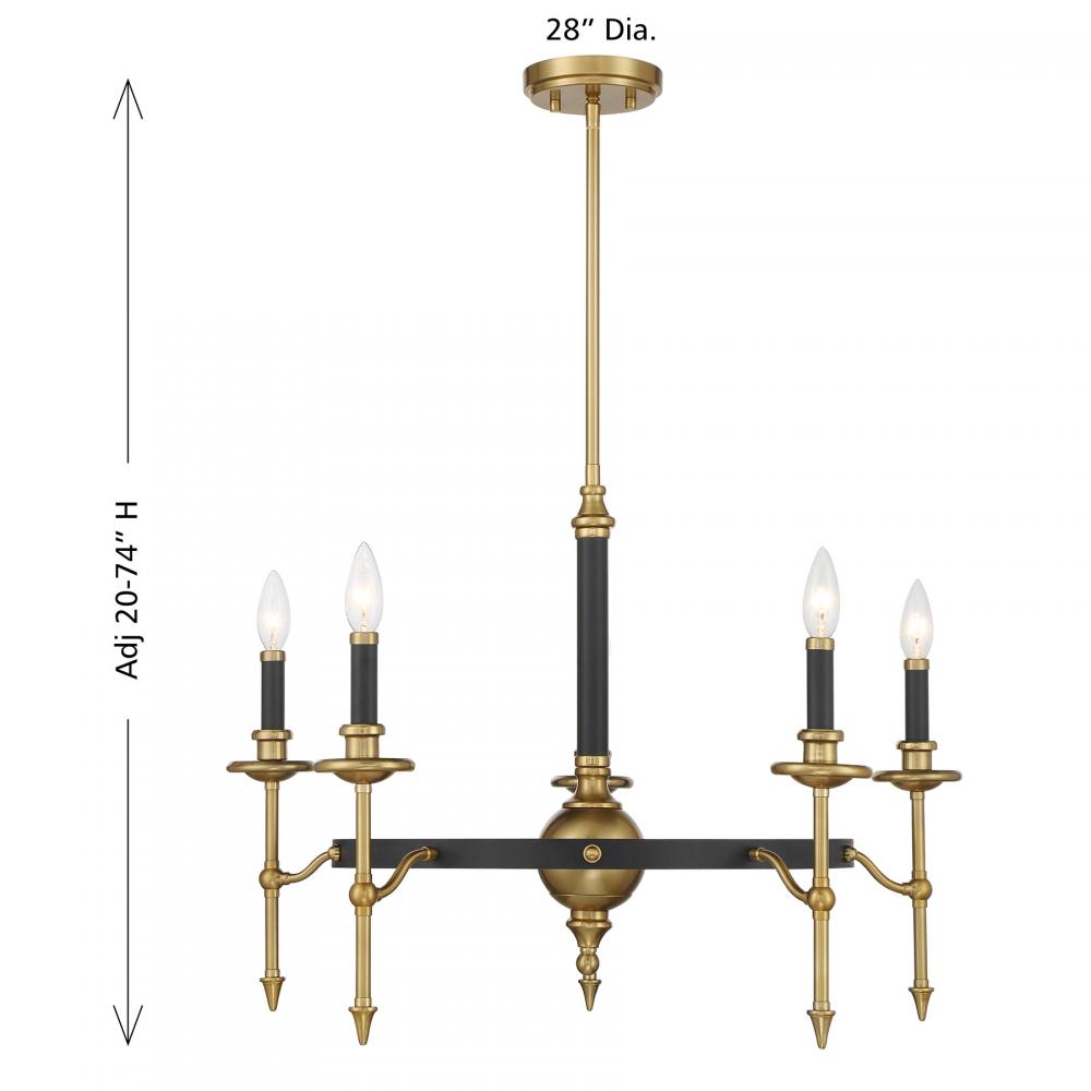 The Savoy House Consulate 5-light chandelier offers up stately and traditional style with a bold new twist thanks to the two-tone Warm Brass and Black finish. Use it to add a regal touch to any room! Consulate is 28" in width and has an adjustable height ranging from 20" to 74". It uses five candelabra size bulbs of up to 60 watts per bulb. Bulbs not included. Comes with four 12" downrods and one 6" downrod.