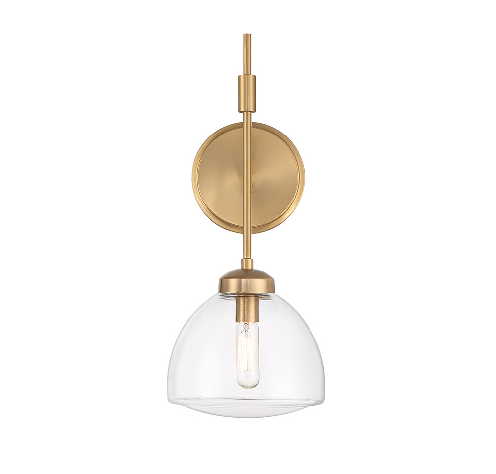 The Savoy House Corbin 1-light sconce brings a crisp, contemporary lighting look to any wall. A molded, curved clear glass shade encases the light source and the Warm Brass finish is beautifully versatile. Corbin is 15" in height, 6.75" in width and extends 8" from the wall. Uses one candelabra size bulb of up to 60 watts. Bulb not included.