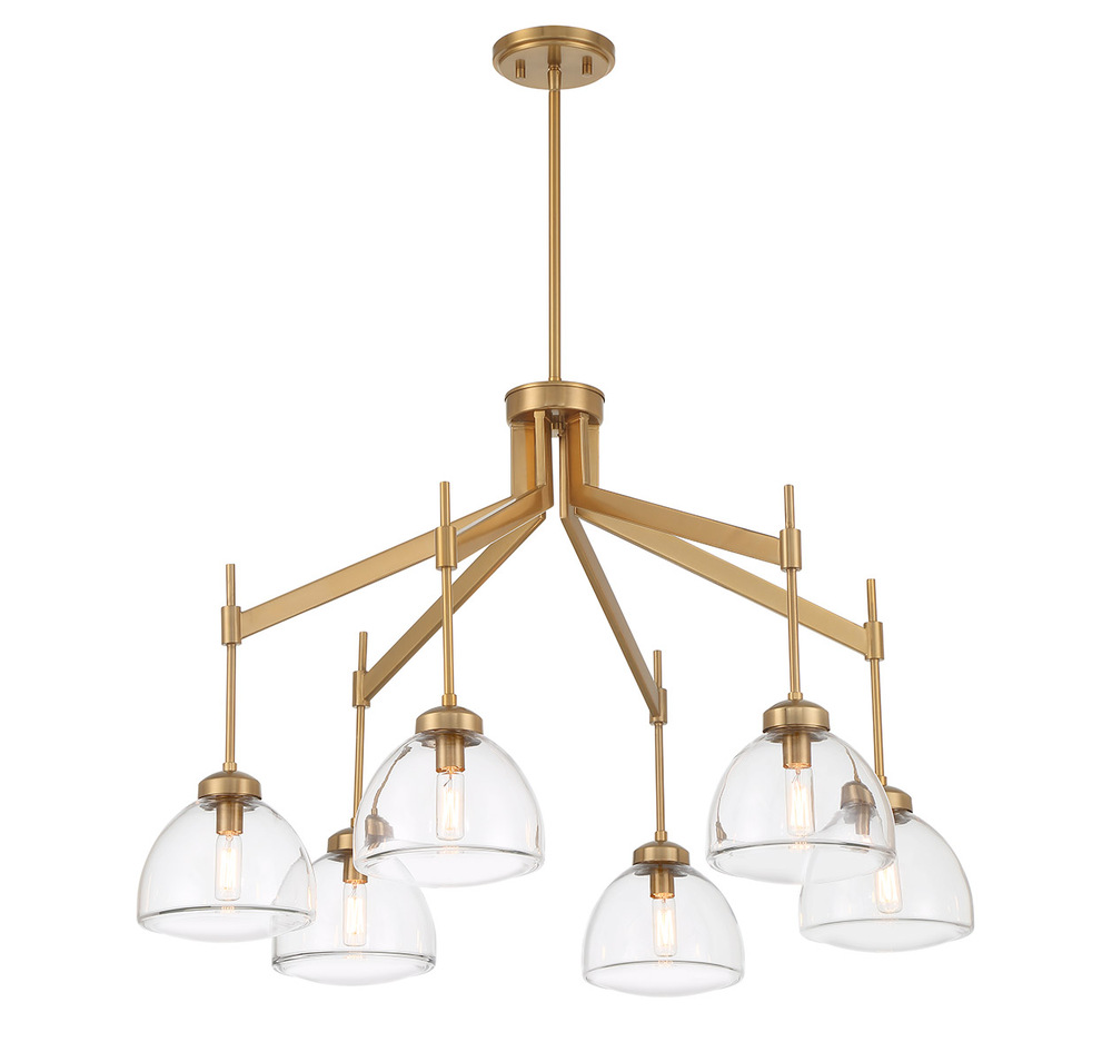 The Savoy House Corbin 6-light chandelier brings a crisp, contemporary lighting look to any space. Molded, curved clear glass shades encase the light sources and the Warm Brass finish is beautifully versatile. Corbin is 31.5" in width and has an adjustable height ranging from 22" to 76". Comes with four 12" downrods and one 6" downrod. Uses six candelabra size bulbs of up to 60 watts per bulb. Bulbs not included.