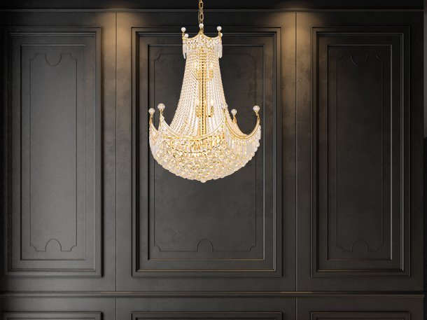 An empire-style chandelier brimming with sparkle, Corona collection hanging fixtures fill a home with brilliant light. The base of the frame forms a hemisphere that is overflowing with clear crystal balls and faceted prisms and tipped with matching crystal balls. Draped crystal octagon strands dangle along the body of the lamp while a gorgeous crystal "crown" matches the edges of the frame, completing the look and giving the design its name. Available in one, two, or three glorious tiers a chrome or gold finish that is dazzling in a dining room, stairwell, or living room.