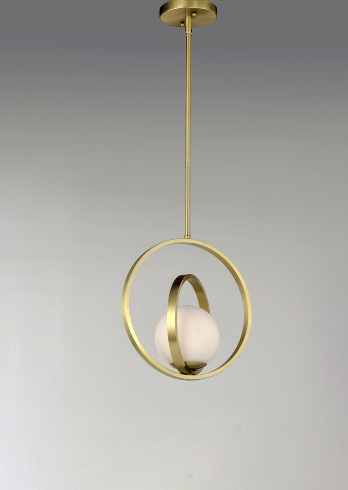 Adjustable rings available in Polished Chrome or Satin Brass add dimension to this contemporary pendant design. Opal white glass softly diffuses light to complete the look.