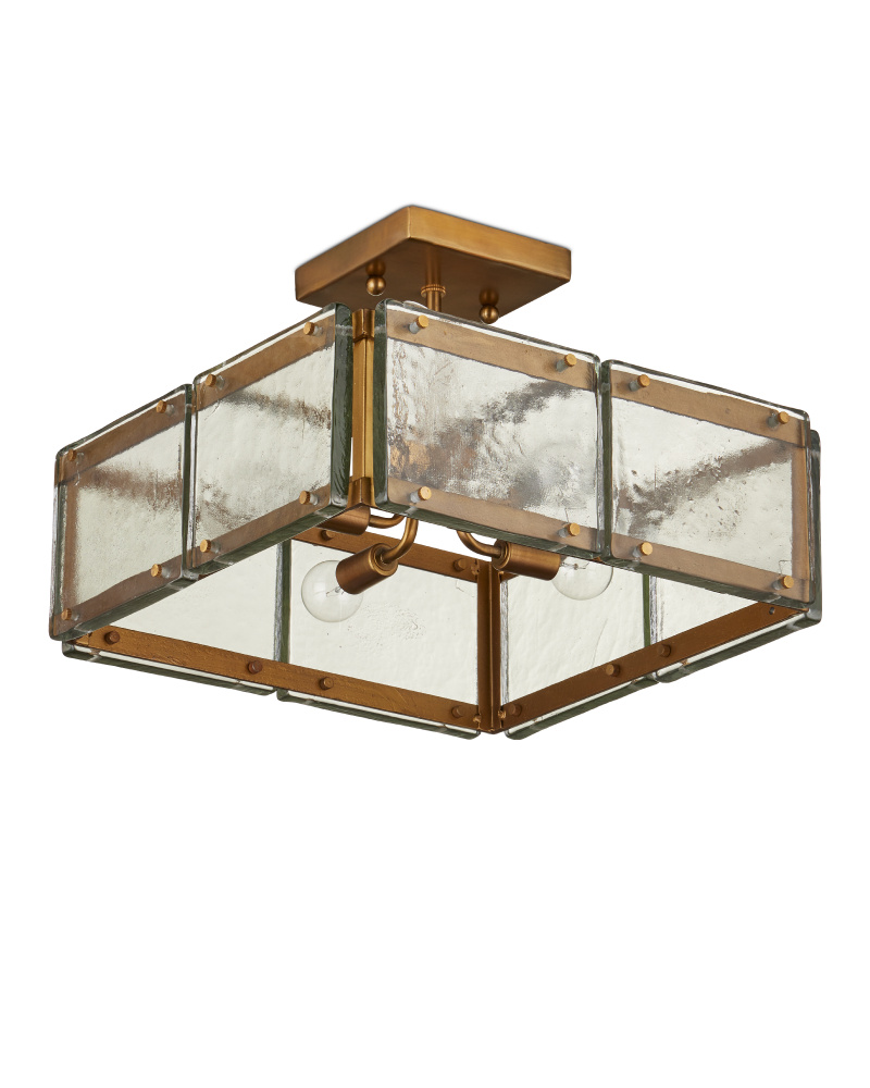 The Countervail Square Semi-Flush Mount was designed with its panes of thick cast glass. The textural surfaces were the starting point for this piece because the mottled nature of the glass would enhance the glow of the illumination from the clear and gold chandelier. Each unique piece of the material is fastened to a metal frame in an antique brass finish. The panes to be held in place with sophisticated screws, making a style statement and allowin each piece to be removable for cleaning.
