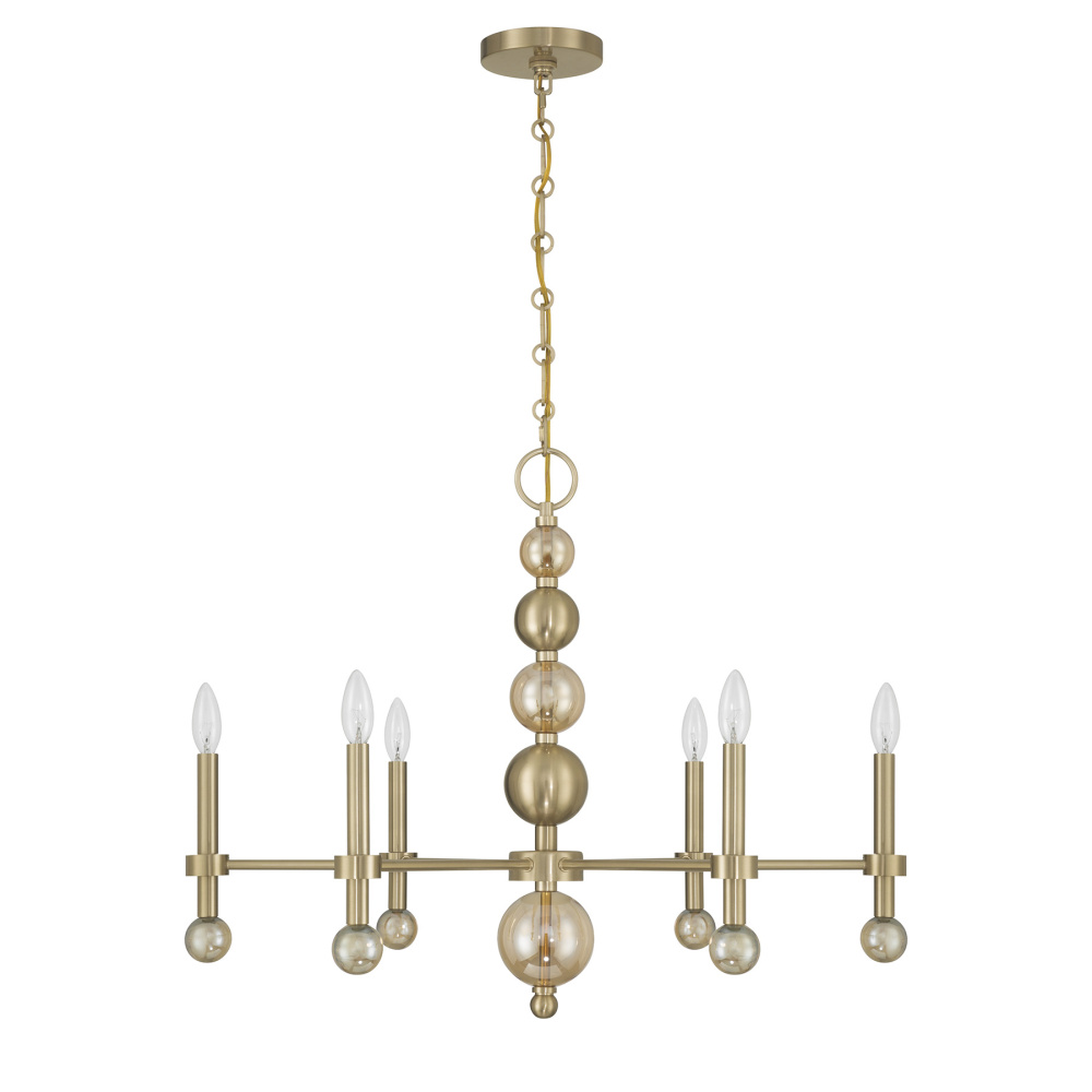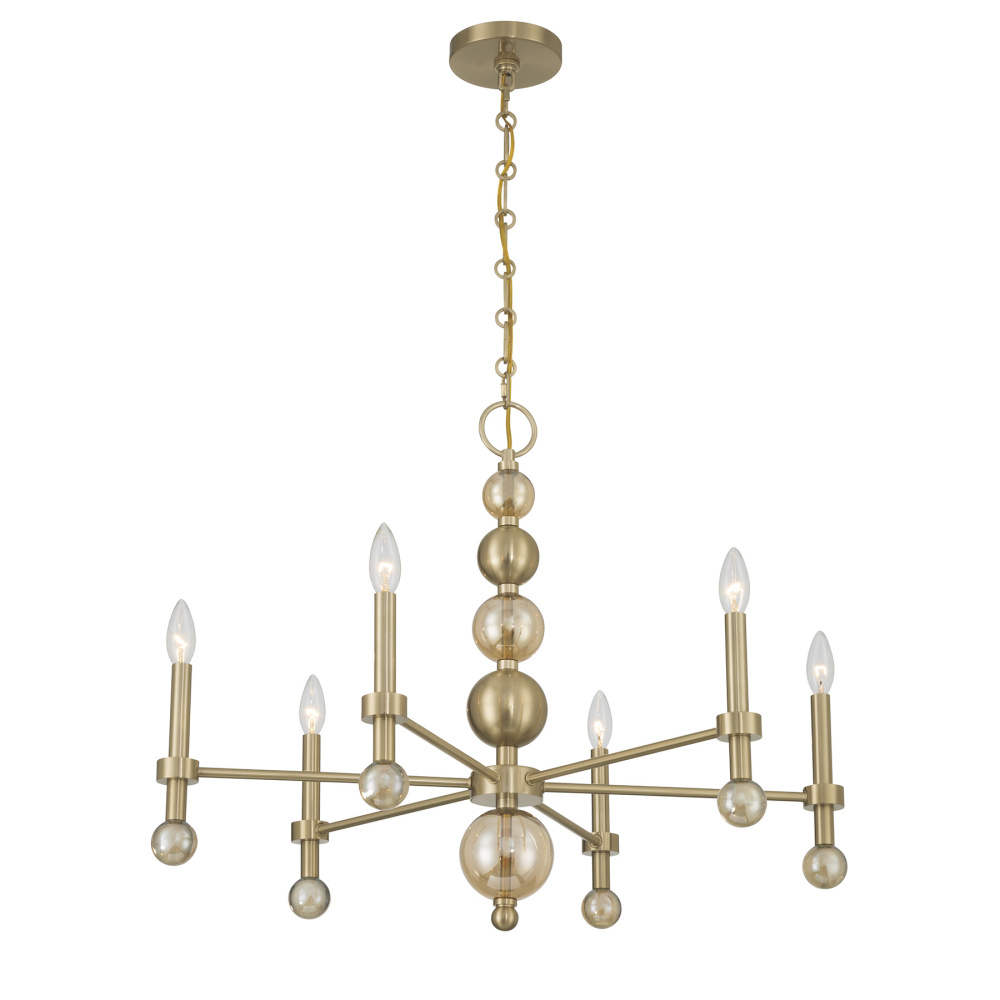 Style bubbles over in the Savoy House Crescent 6-light chandelier, delivering a look worth celebrating. Globes of champagne-hued glass shimmer with effervescent charm as the Noble Brass finish adds an extra layer of radiance. Crescent is 23.63" in height and 30" in width. It uses six candelabra size bulbs of up to 60 watts per bulb. Bulbs not included. Comes with 120" of chain.
