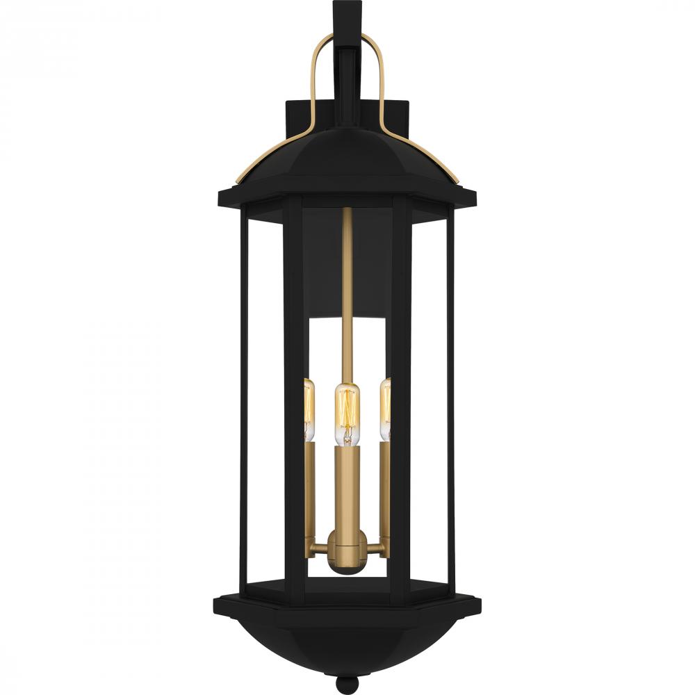 Illuminate your homes exterior with the timeless style of Crestfield lanterns. The elongated frame is finished in matte black and accented beautifully with brushed gold for a hint of luster and sophistication. Clear tempered glass panels complete the look
