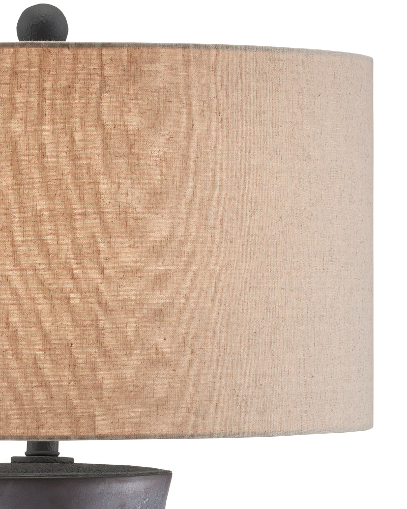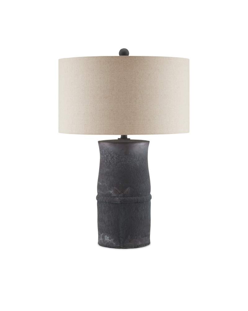 The Croft Table Lamp is a rough luxe offering made of ceramic in a satin dark gray finish. The textural surface has a slight curve as it nears the shade, a central ring that bulges from its profile, and a very subtle leaf motif that is carved into its body at intervals. The pitting on the surface of this dark gray lamp will be a textural introduction to a space.