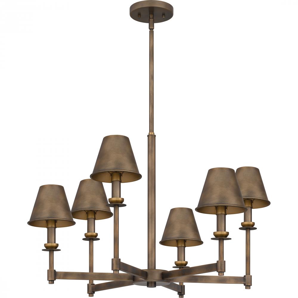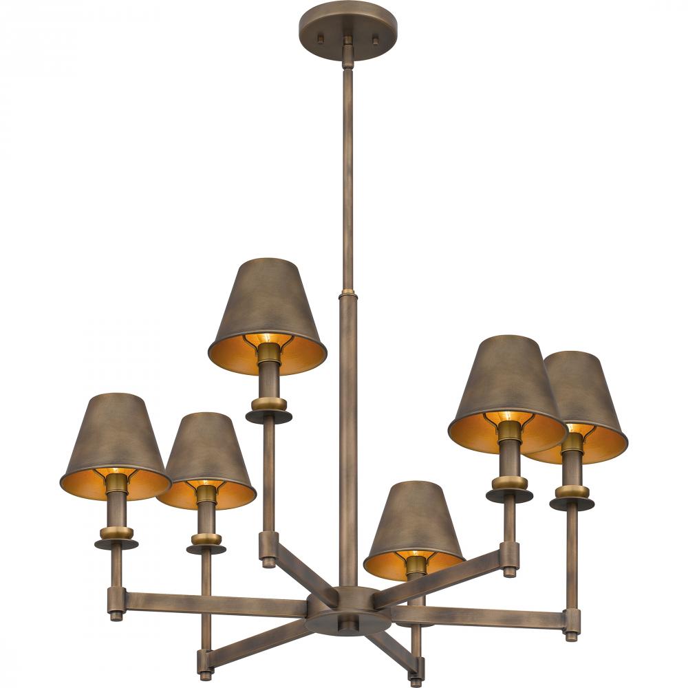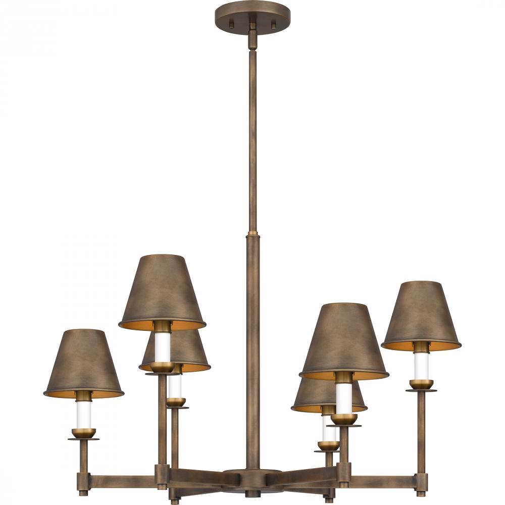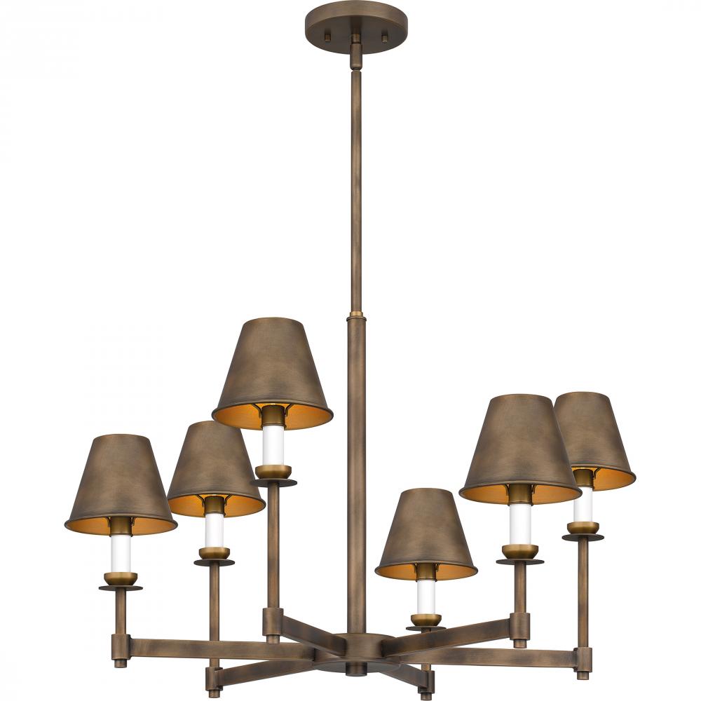The Cross chandelier features a statuary bronze finish that illuminates handsome style. Metal shades add drama and warmth to the classic silhouette, making Cross a perfect choice in a study, living room, or dining room area. The slender candle sleeves come