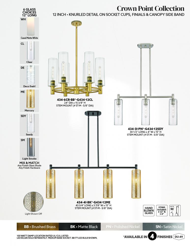 Details abound in the Crown Point Collection with an industrial take on modern sophistication. This stunning line of fixtures features cylindrical glass set in an updated restoration style frame with intricate knurling detail on the sockets, canopy, and fi