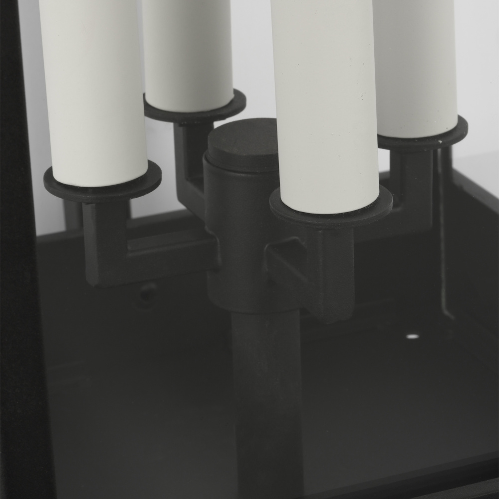The Cupertino outdoor series by Chapman & Myers was created to embody a more transitional classic rectangular lantern profile. Rather than feature filament tube bulbs, each lantern has a more traditional candelabra with cream candle tubes to complete the design. The top and bottom of each lantern have an almost architectural stepped detailing.
