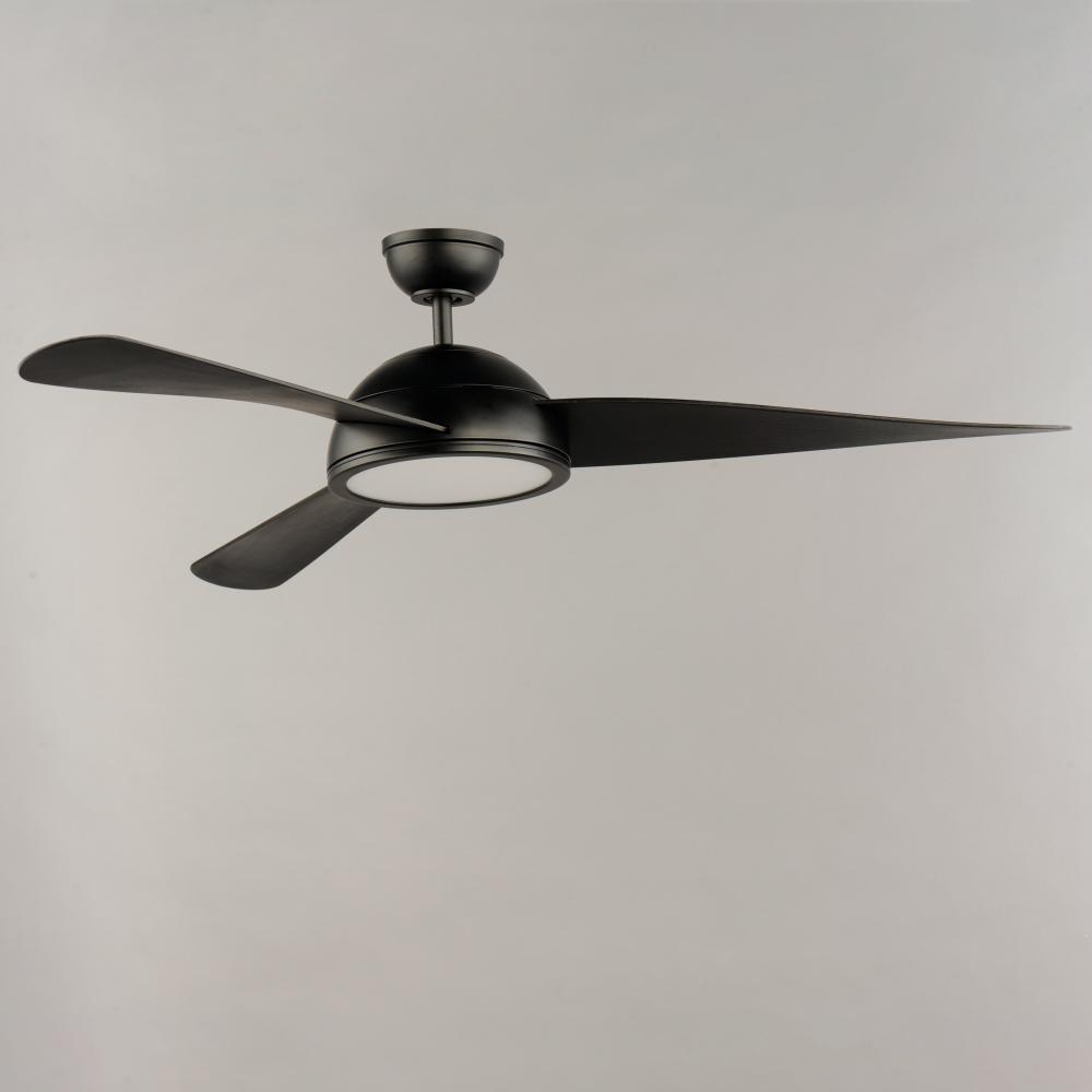 Sweeping arcs define this fan, designed for contemporary and refreshing upgrades. The central housing is domical, from which a trio of uniquely curved fan blades smoothly rotate. Available in Satin Nickel with Silver blades and Black with two-tone Walnut/B