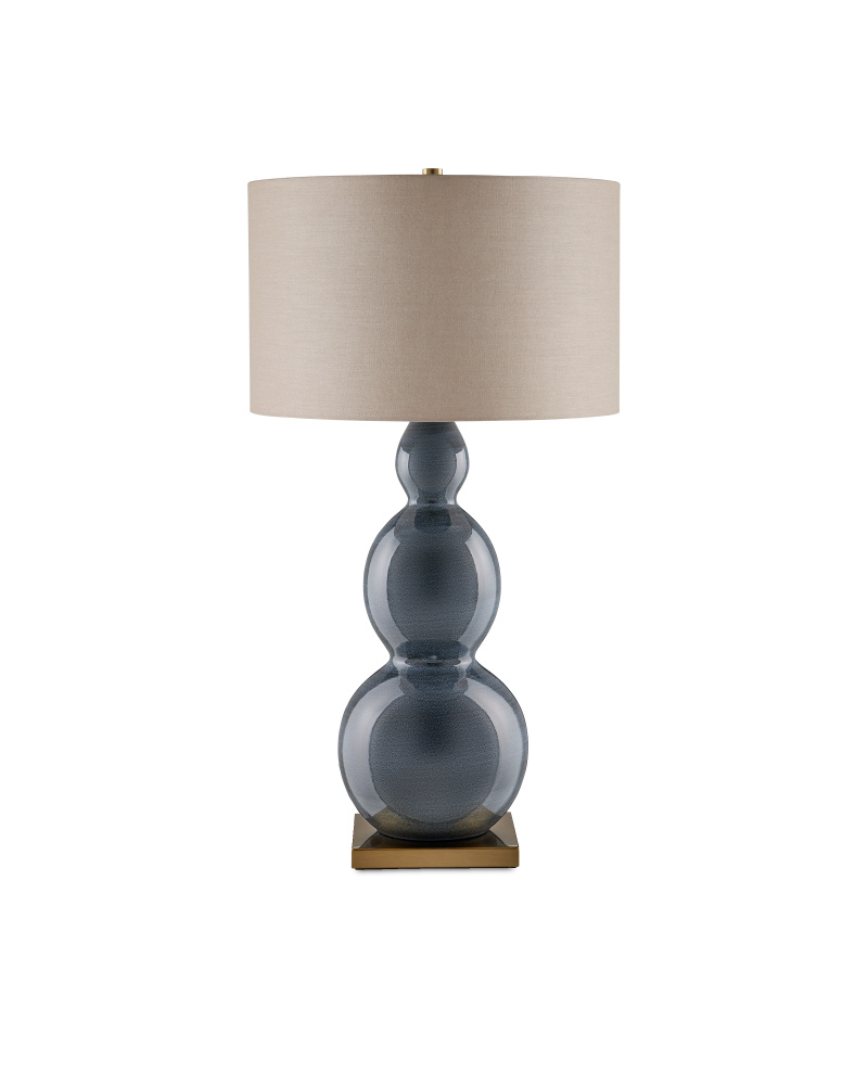 The Cymbeline Table Lamp has a triple-gourd shape with a surface that shines. The body of the lamp has a gray glazing that is stippled so delicately, it reads as one hue. The gray table lamp is topped with a natural linen shade and stands on a brass square base.
